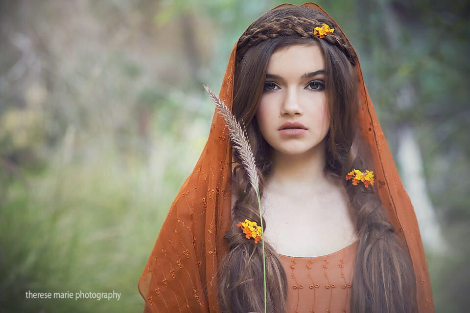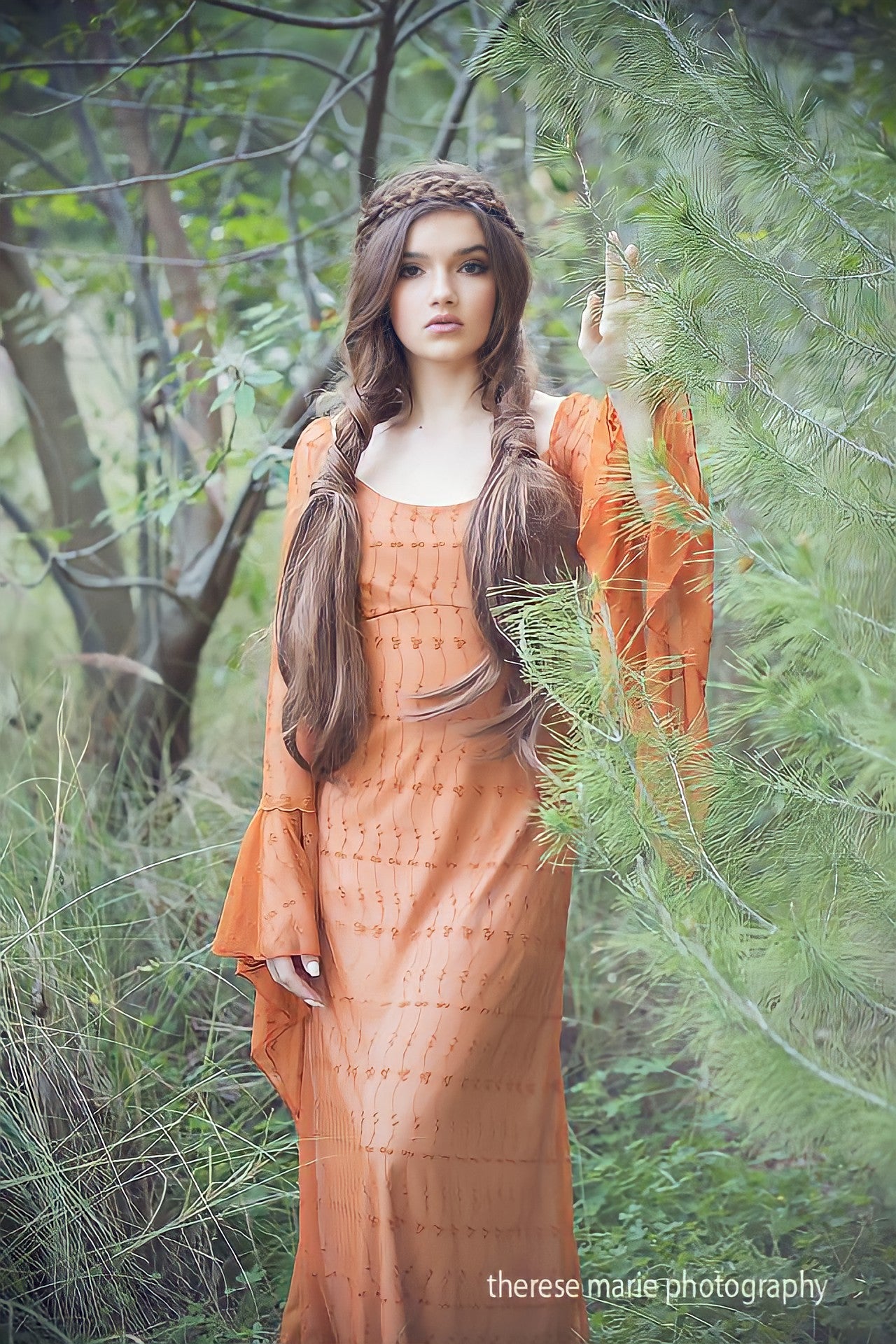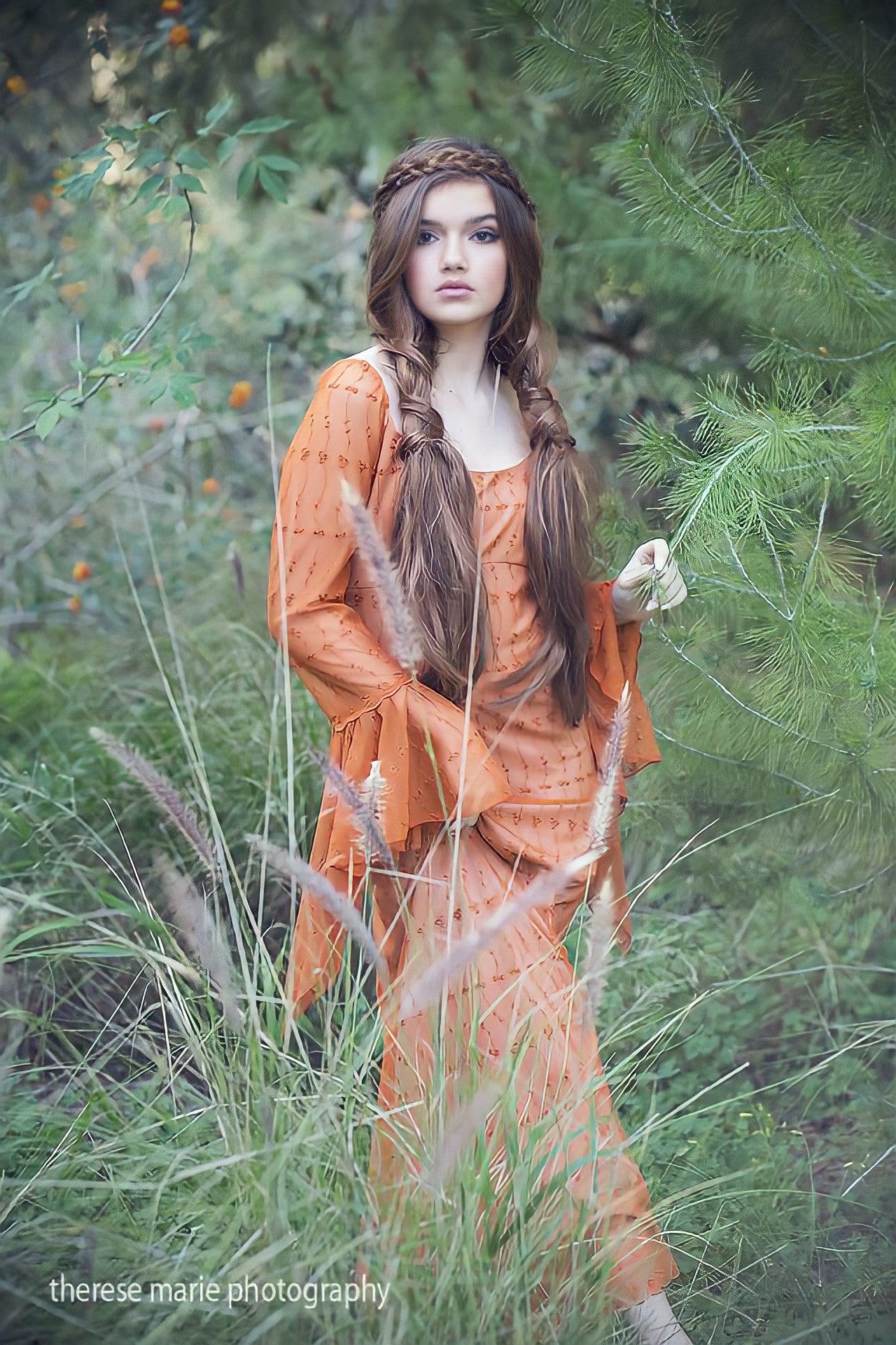 Bridesmaid Burnt Orange color empire waist maxi dress featuring sheer bell sleeves and scollop hem.