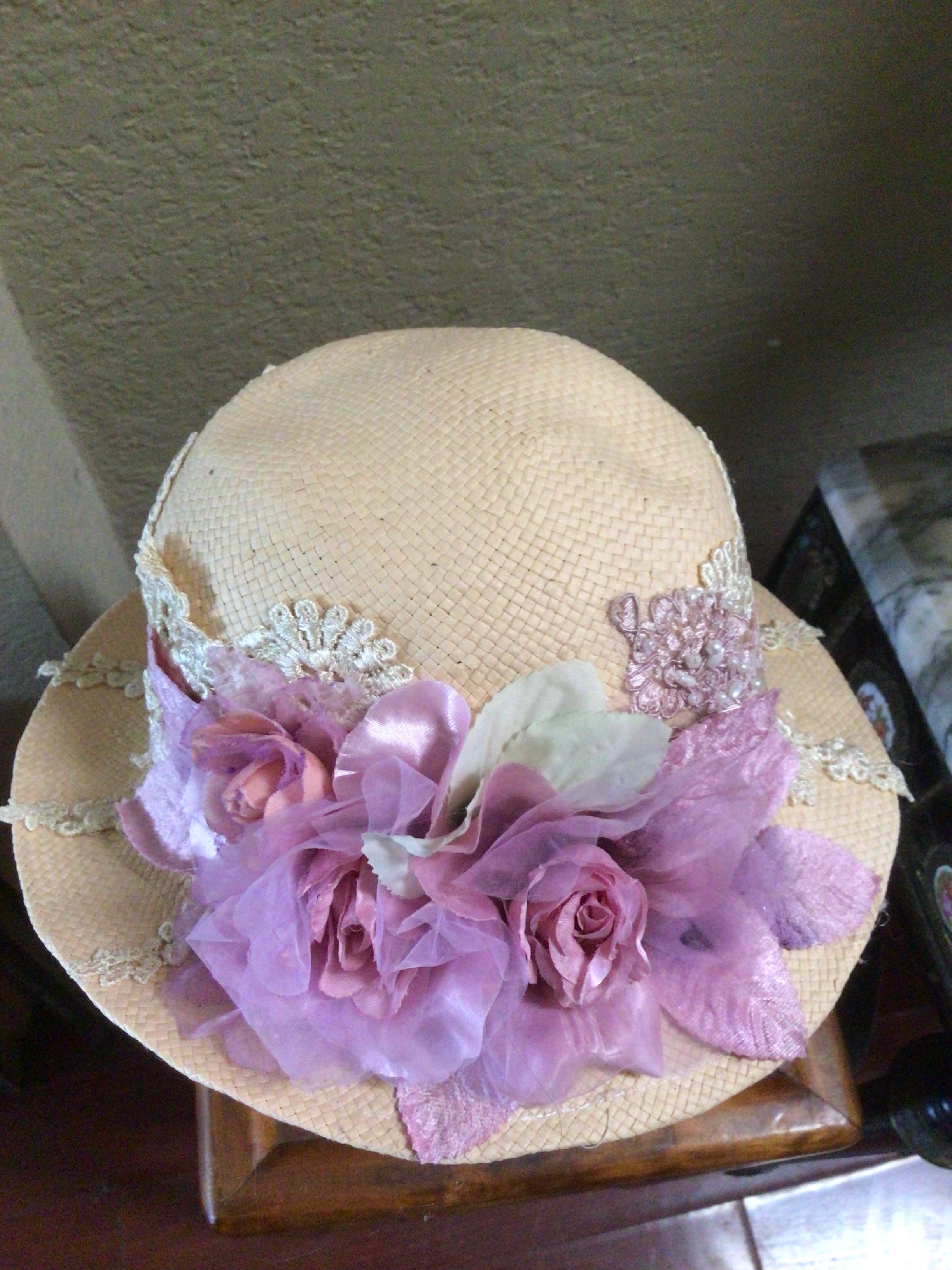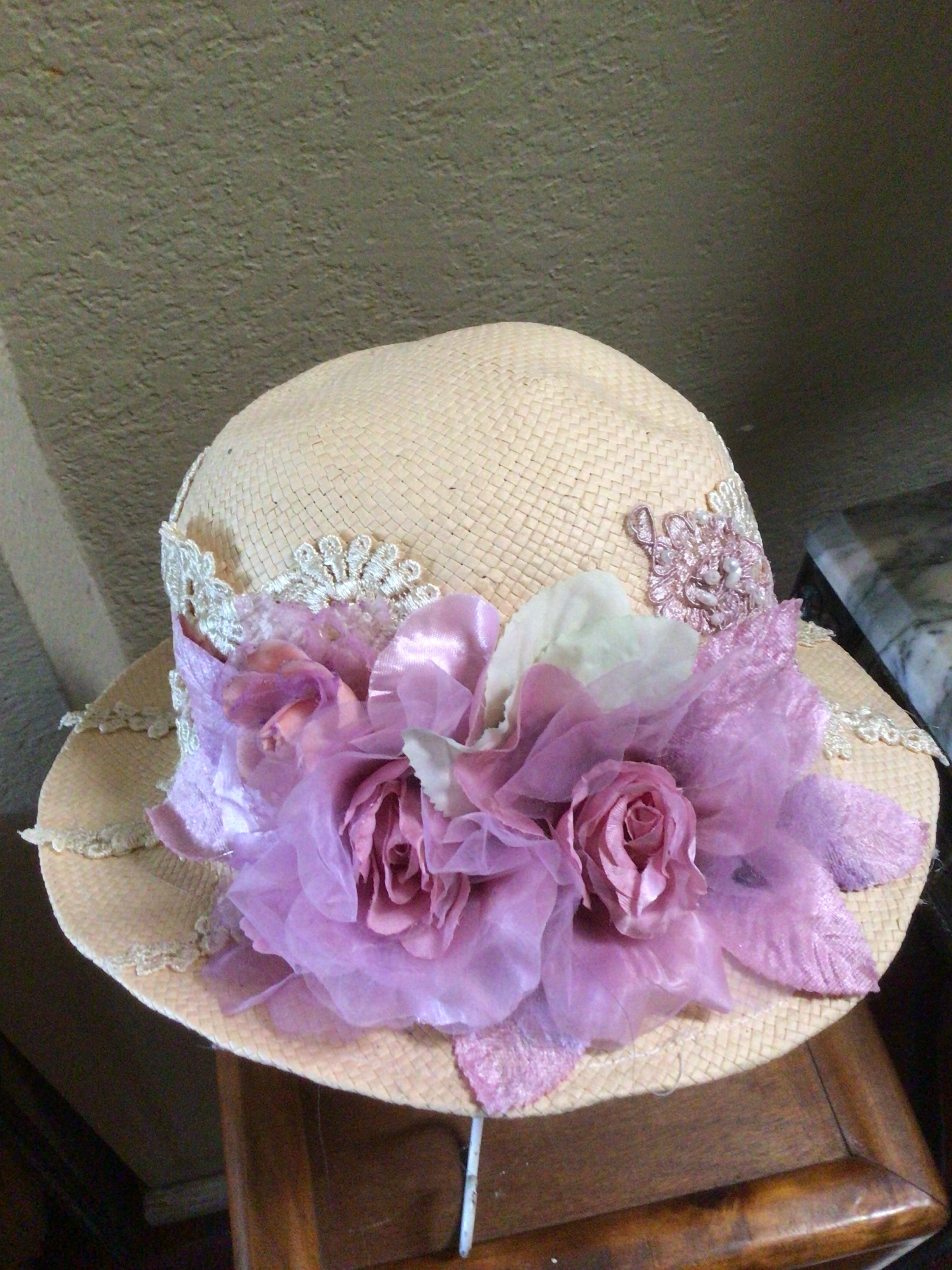 Beautiful short brim summer hat hand decorated with organdy and velvet flowers with a Venetian trim around the hat.