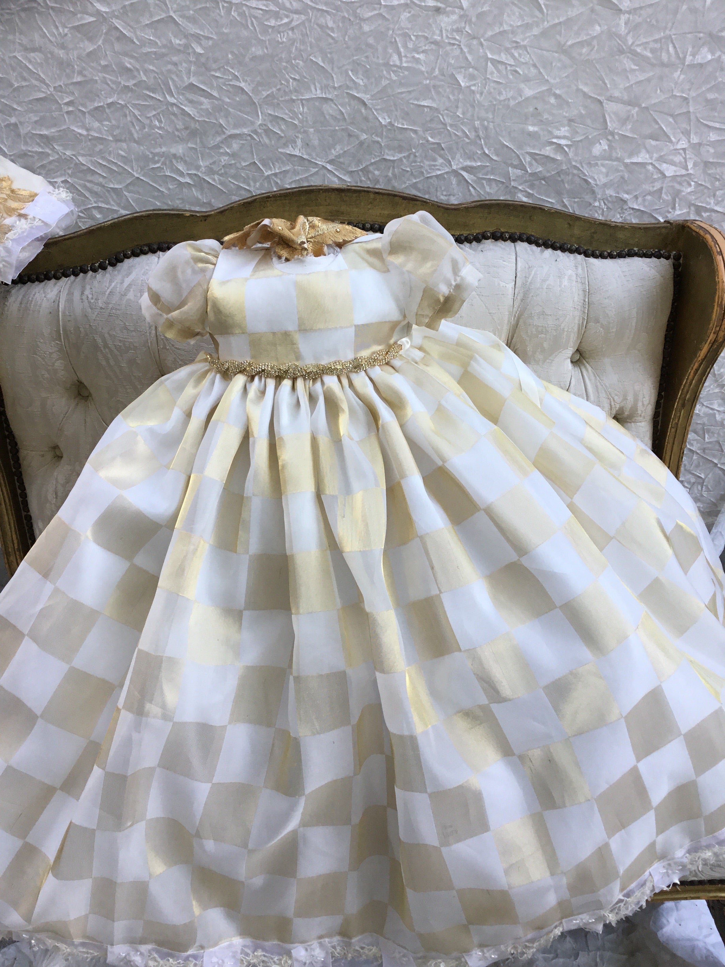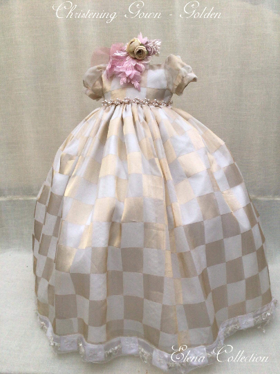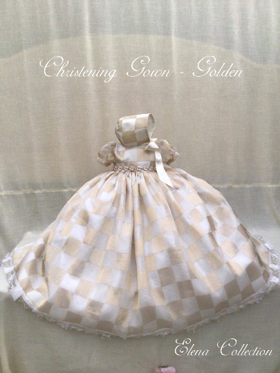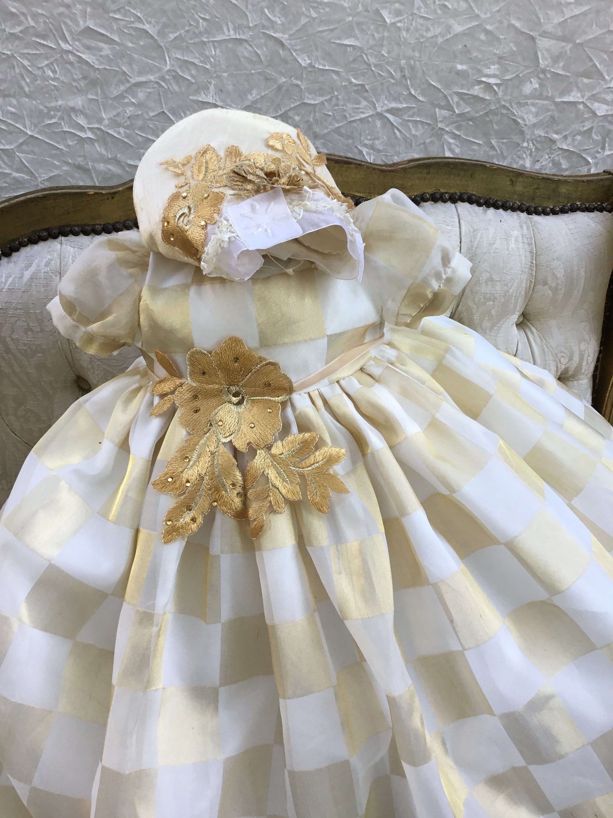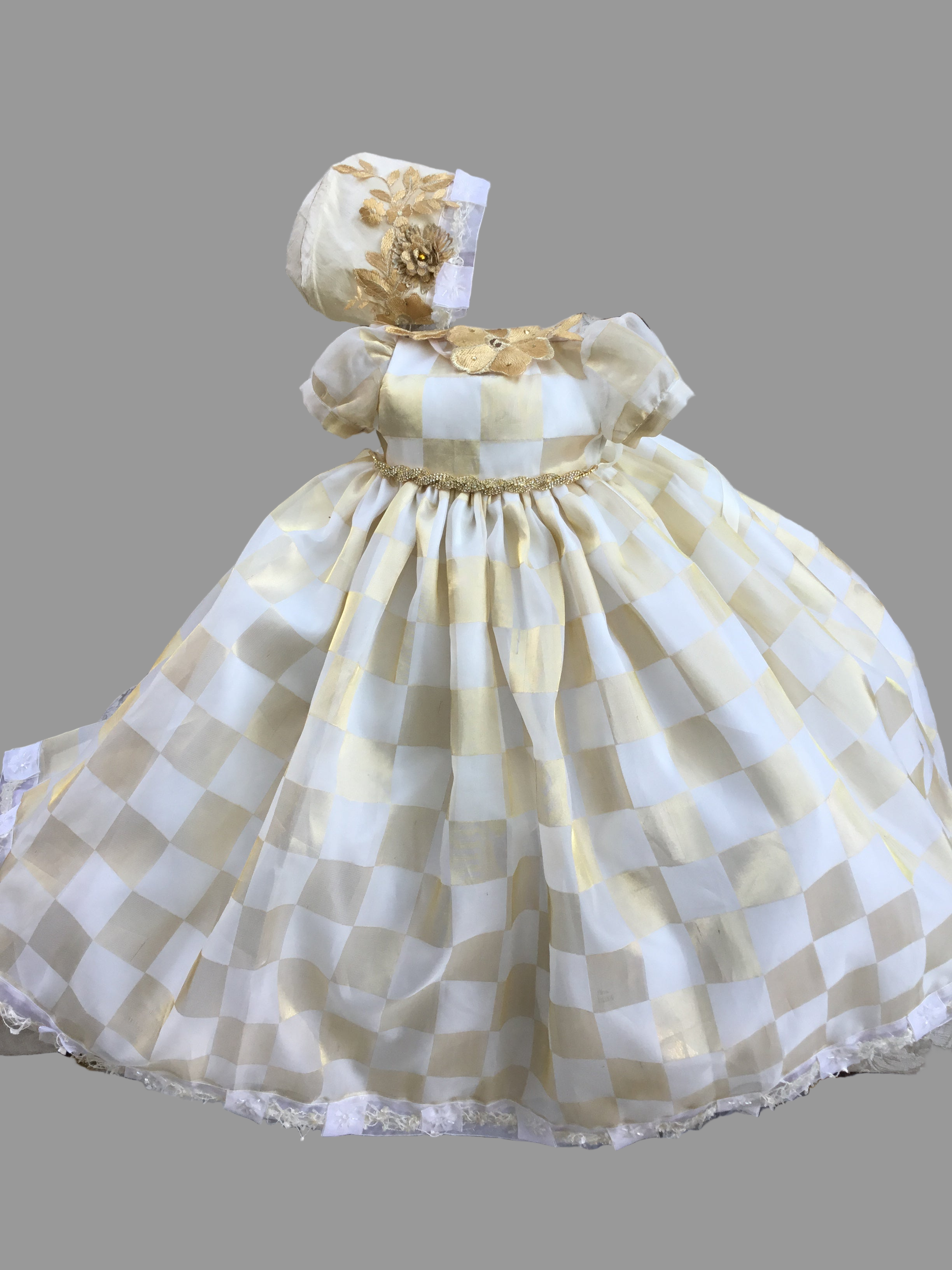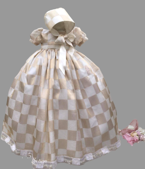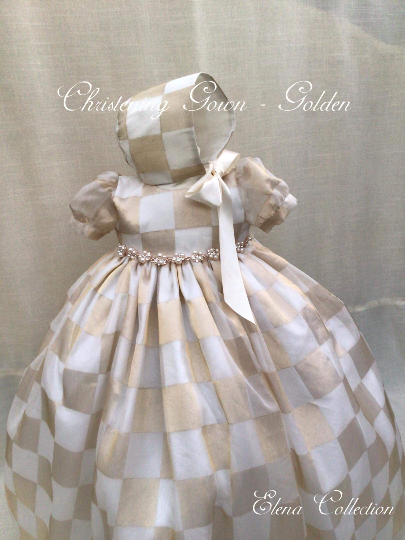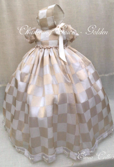 Christening Unique Couture Golden gown and bonnet are crafted from stunning Golden Plaid Silk, fully lined with soft fabric and enhanced with crinoline for a full, elegant shape. Features include an open back with hand-sewn buttons, piping on the neckline, puffy sleeves, a wide overlay skirt, and a satin ribbon belt. Accessories like belts, headbands, and shoes are sold separately. Fabrics used: - Pure Golden Plaid Silk - Soft lining - Crinoline for skirt fullness