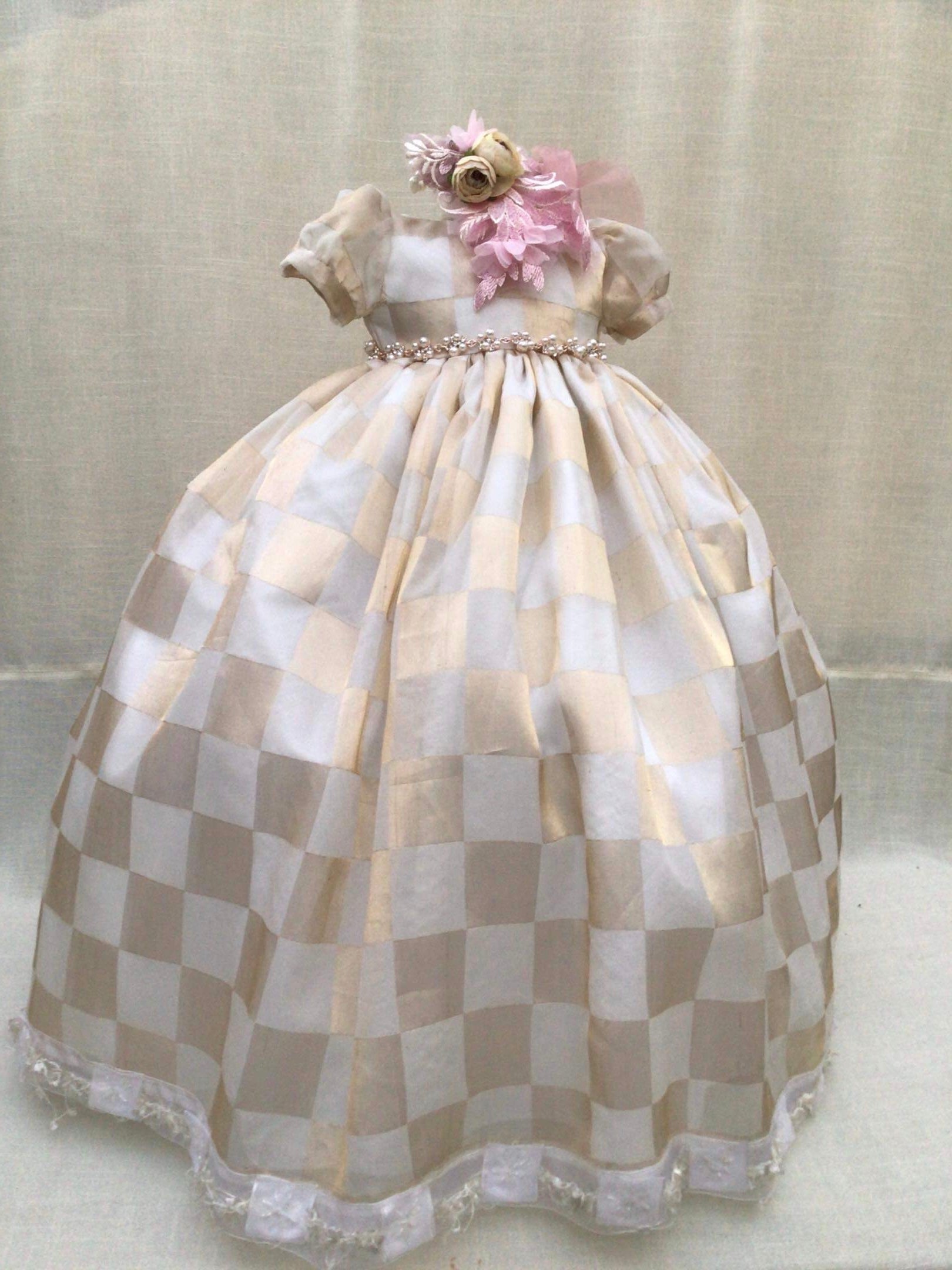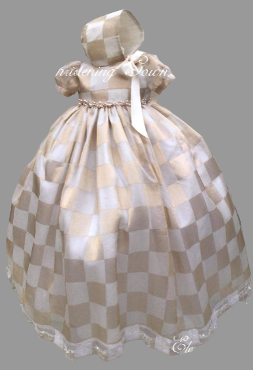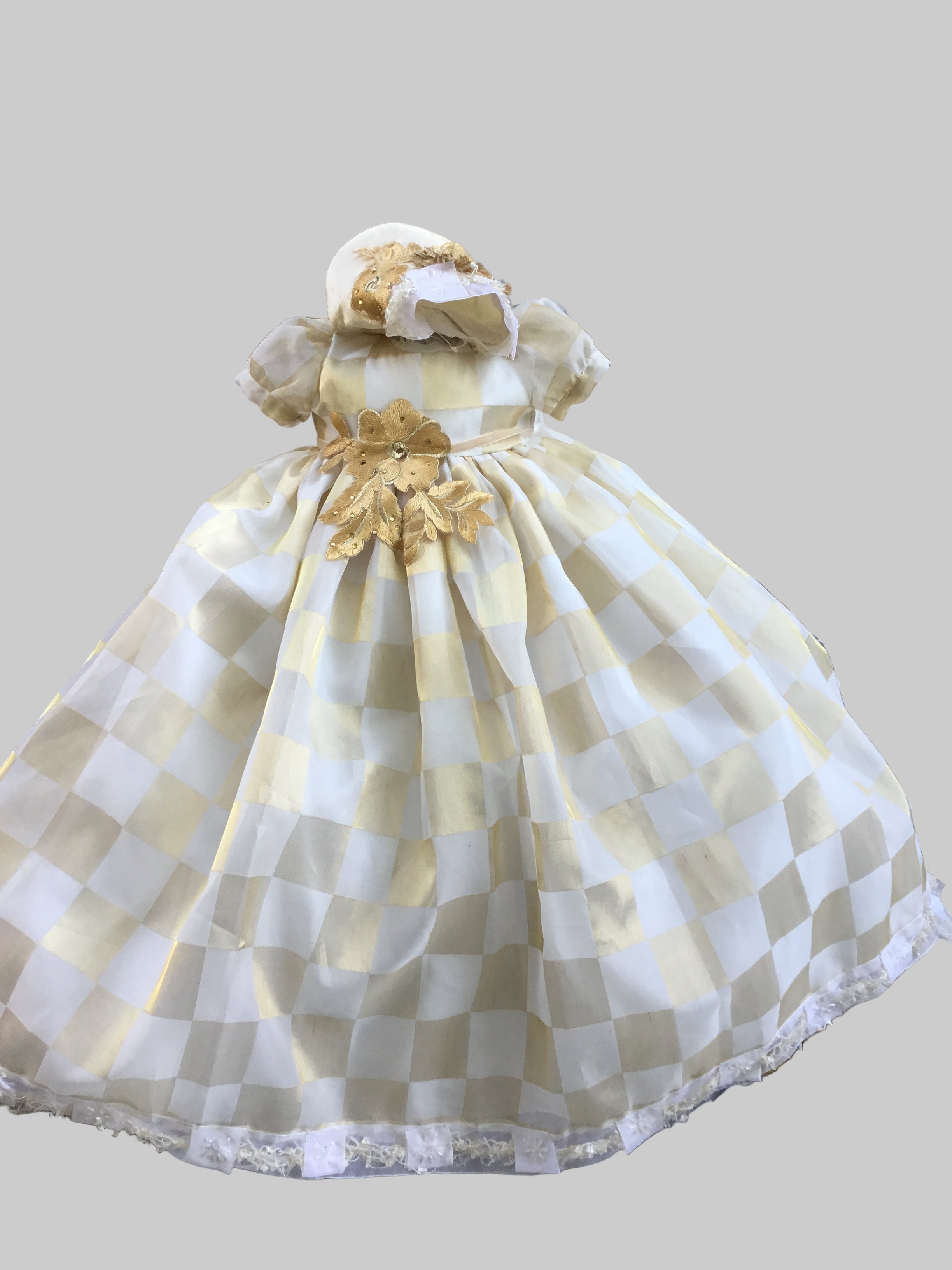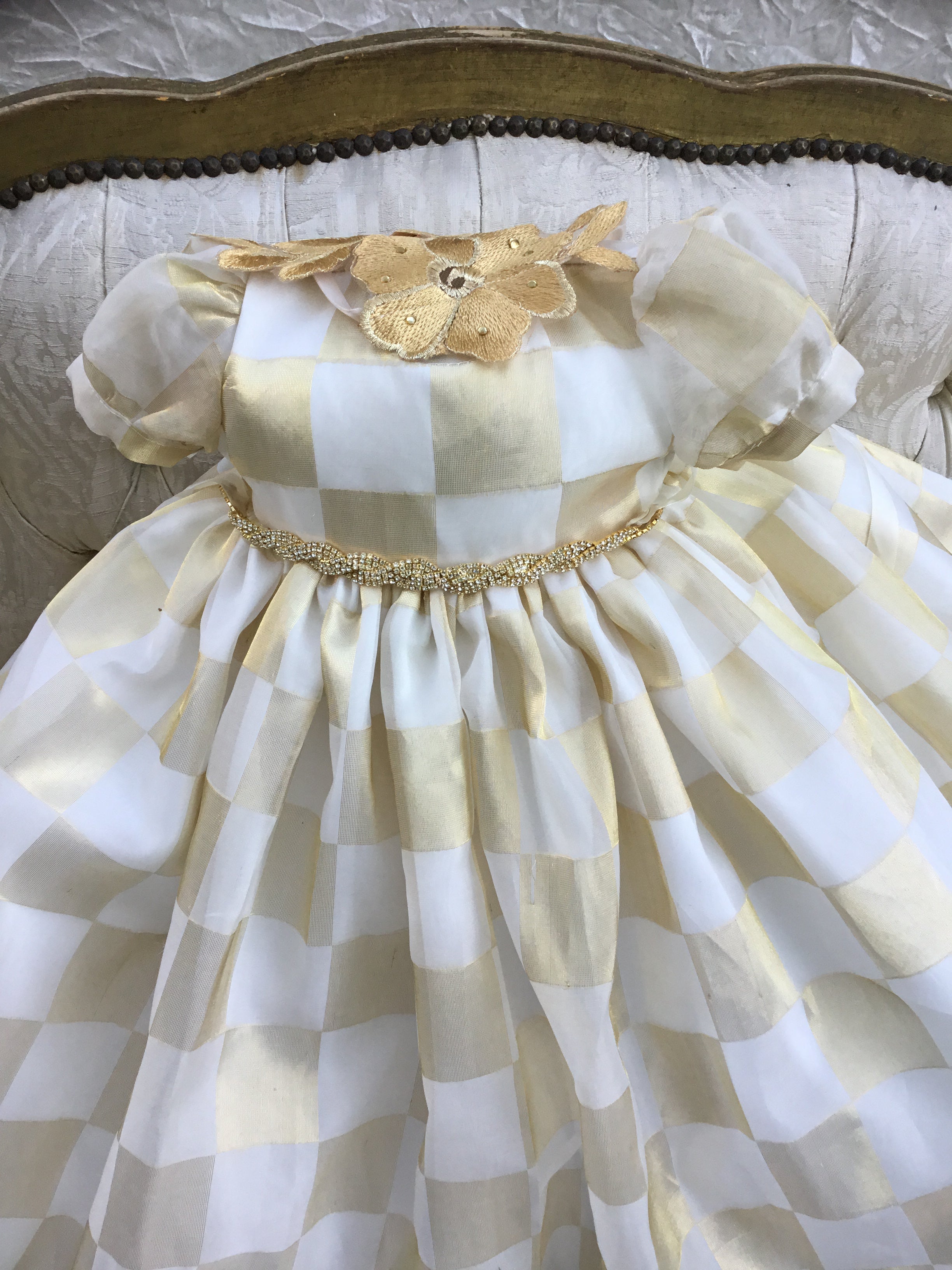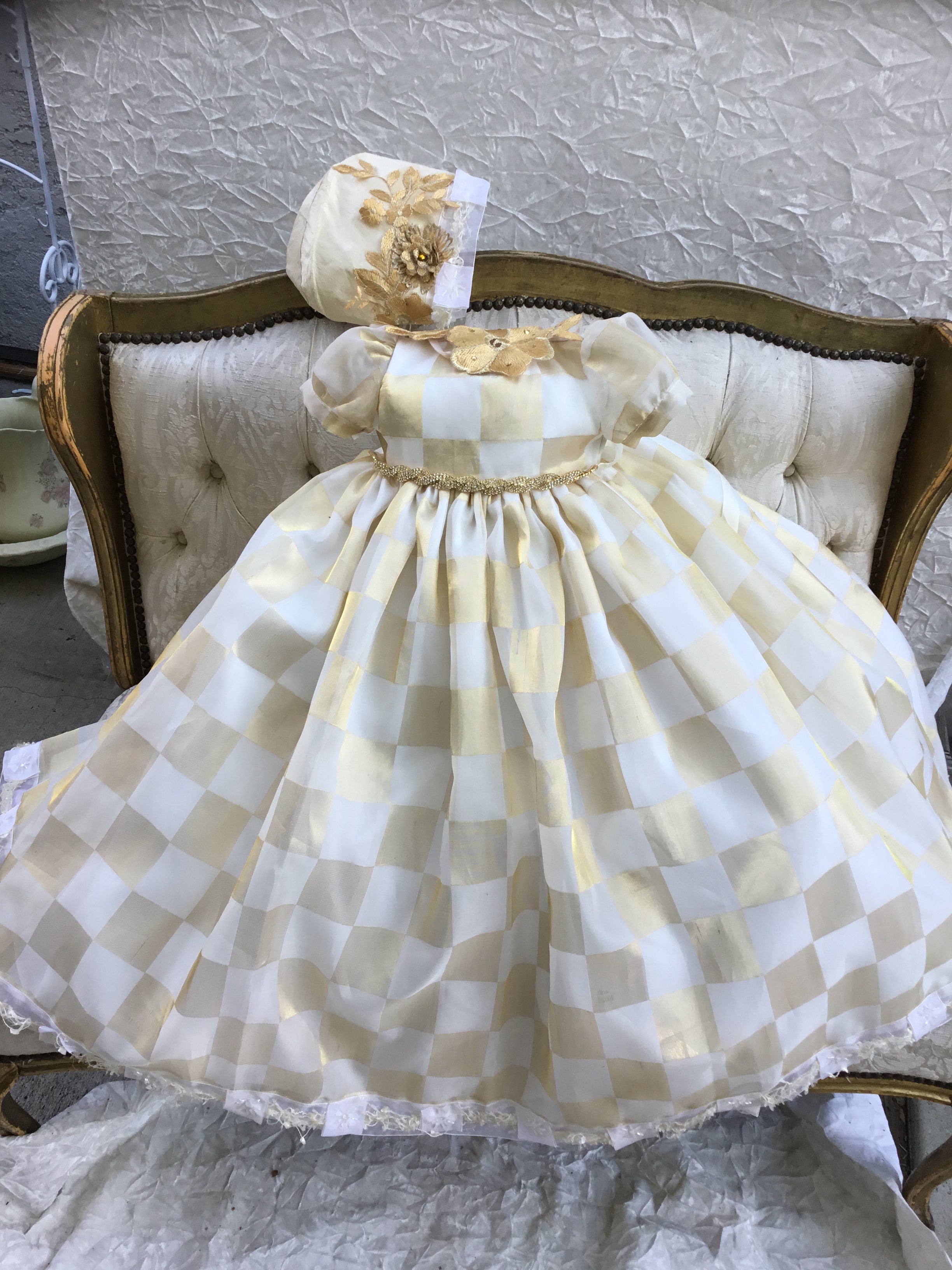 Christening Unique Couture Golden gown and bonnet are crafted from stunning Golden Plaid Silk, fully lined with soft fabric and enhanced with crinoline for a full, elegant shape. Features include an open back with hand-sewn buttons, piping on the neckline, puffy sleeves, a wide overlay skirt, and a satin ribbon belt. Accessories like belts, headbands, and shoes are sold separately. Fabrics used: - Pure Golden Plaid Silk - Soft lining - Crinoline for skirt fullness