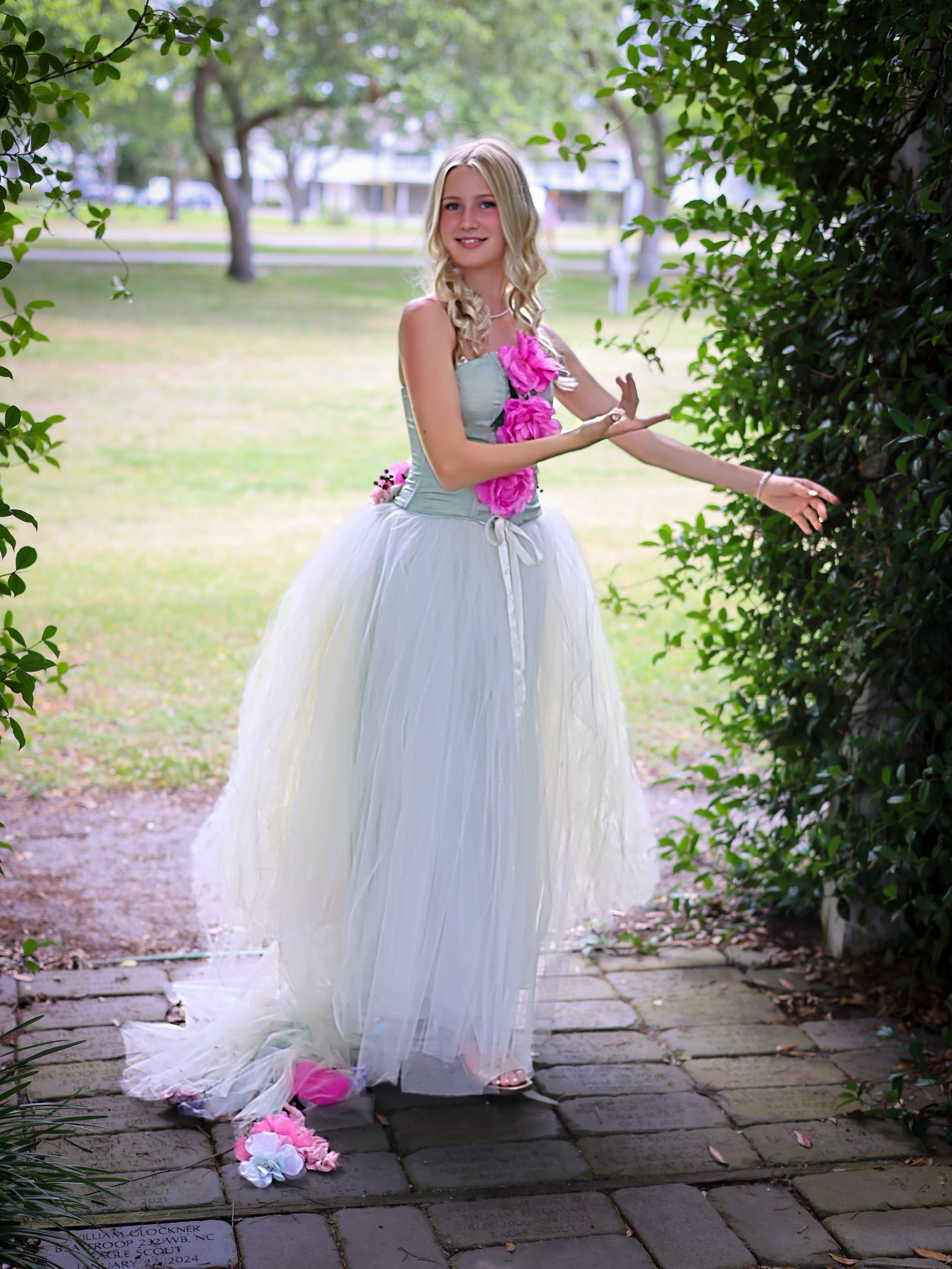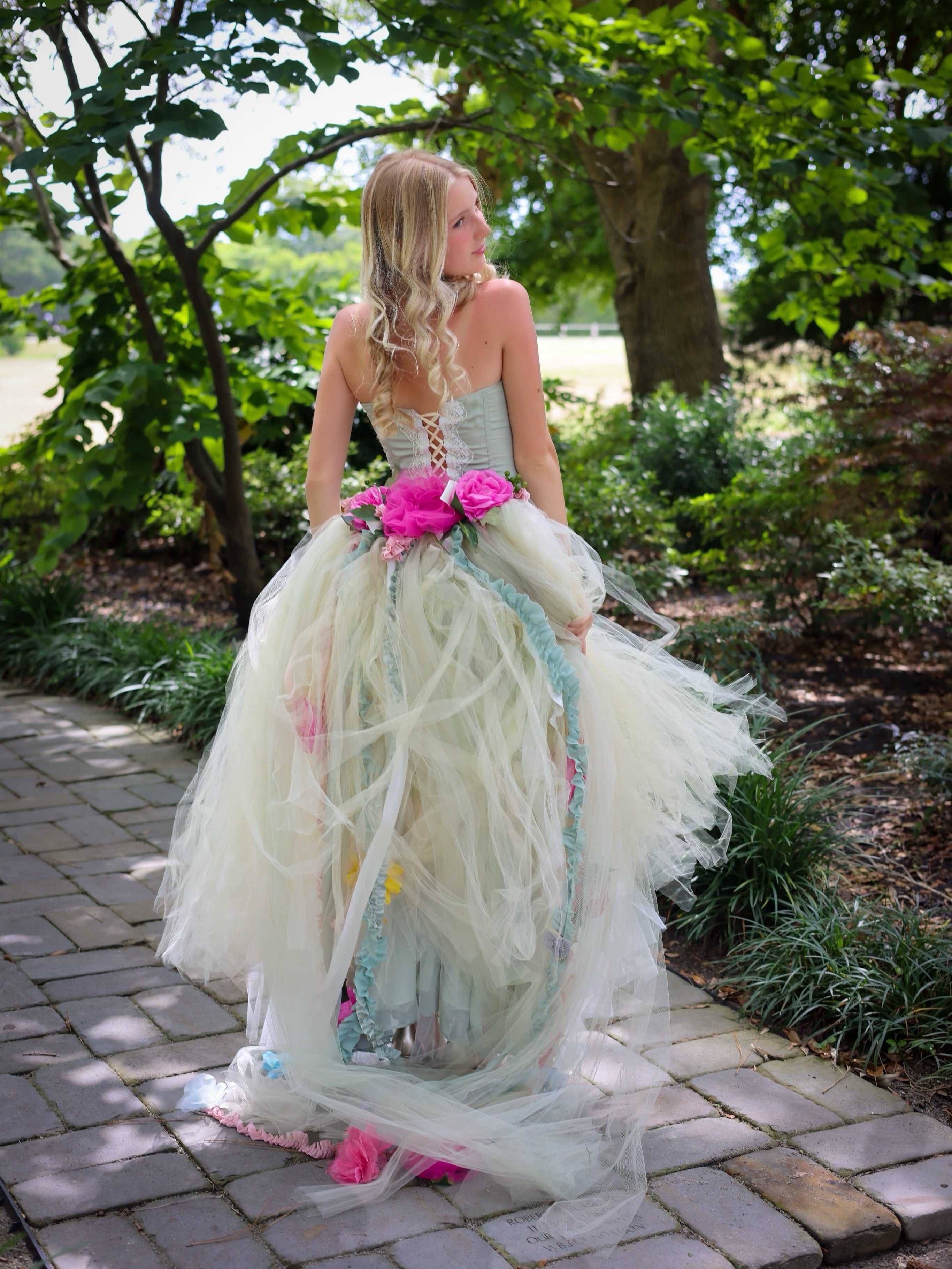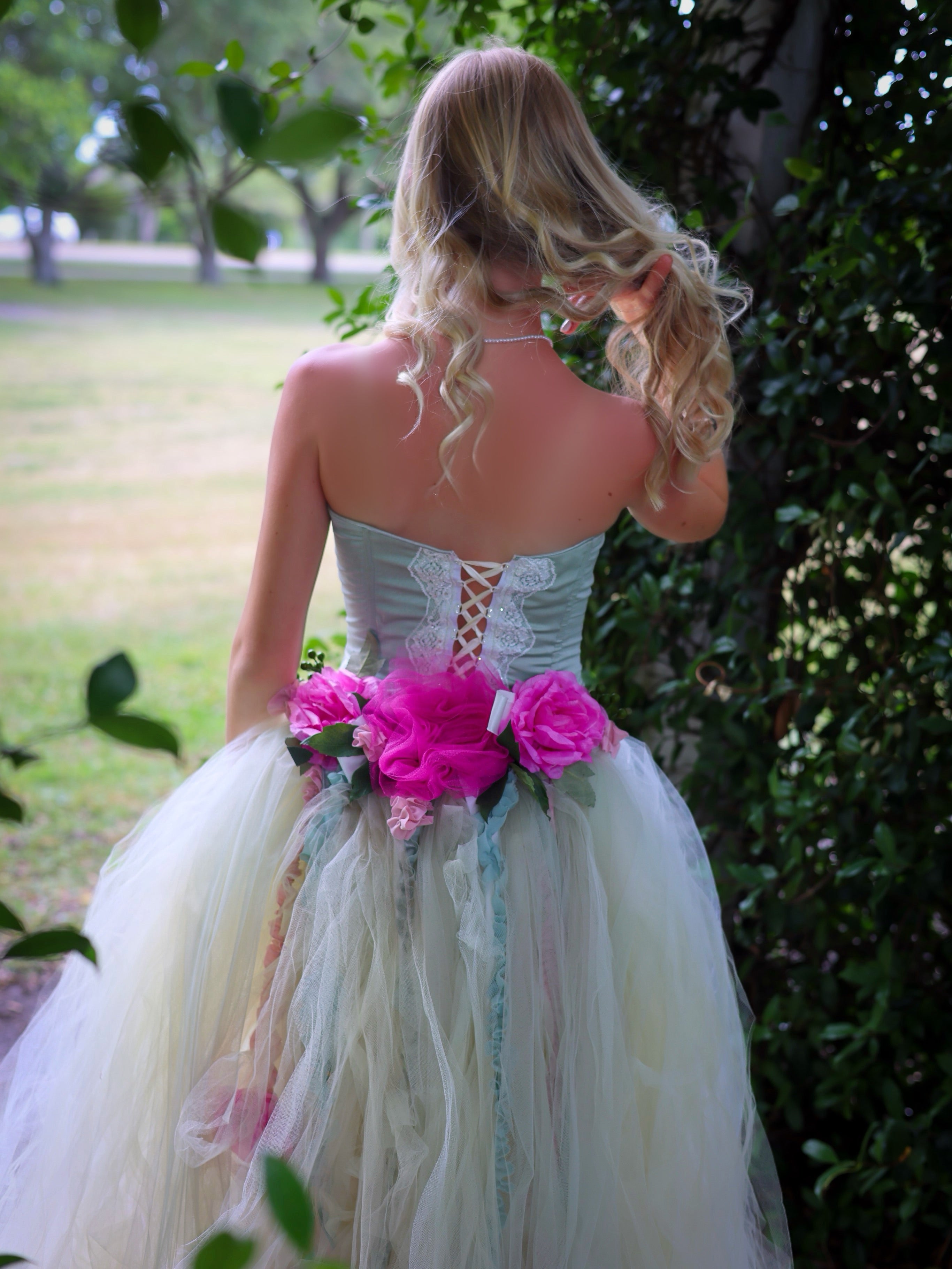 Corset set tulle skirt and detachable train hand decorated with flowers, silk strings, pearls ….. this beautiful wearable art set will make feel like a princes. Available in Ivory color for a wedding, photo shoot and more.
