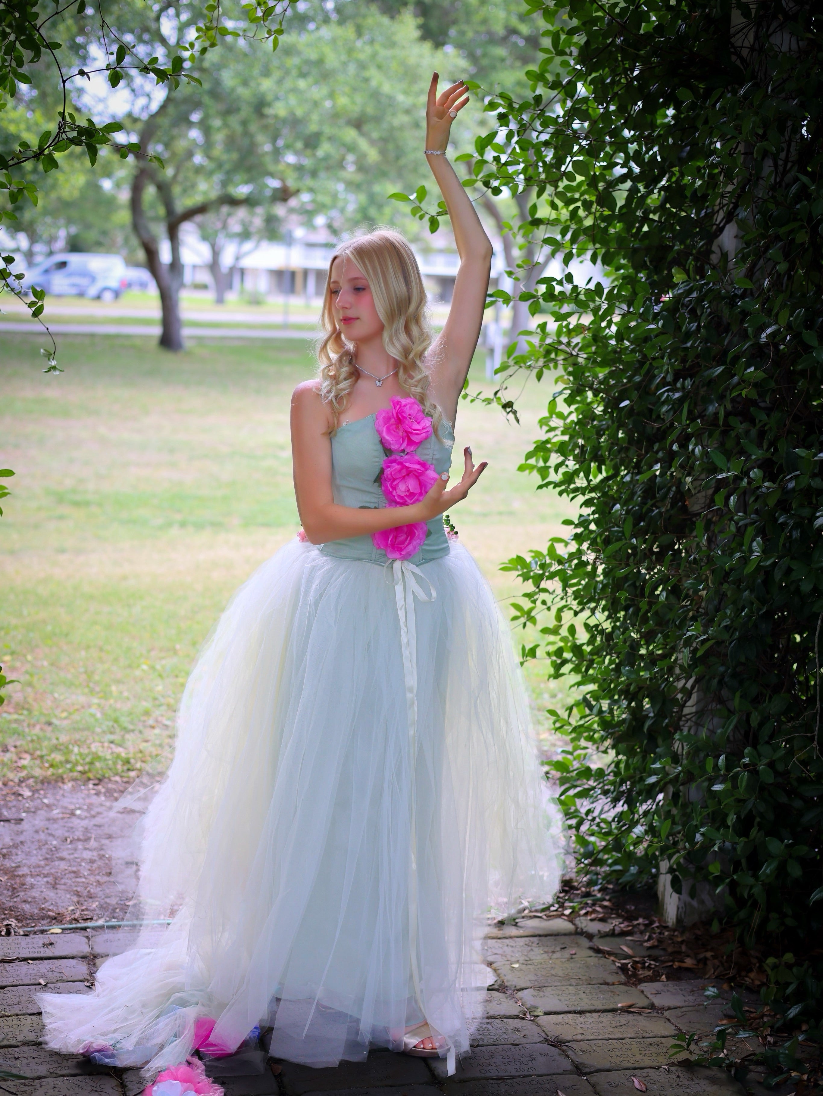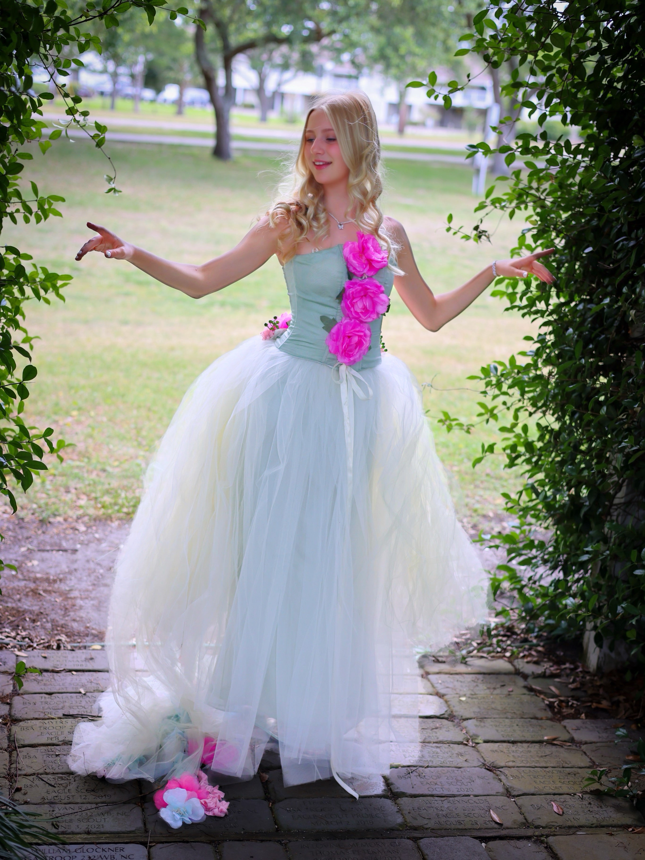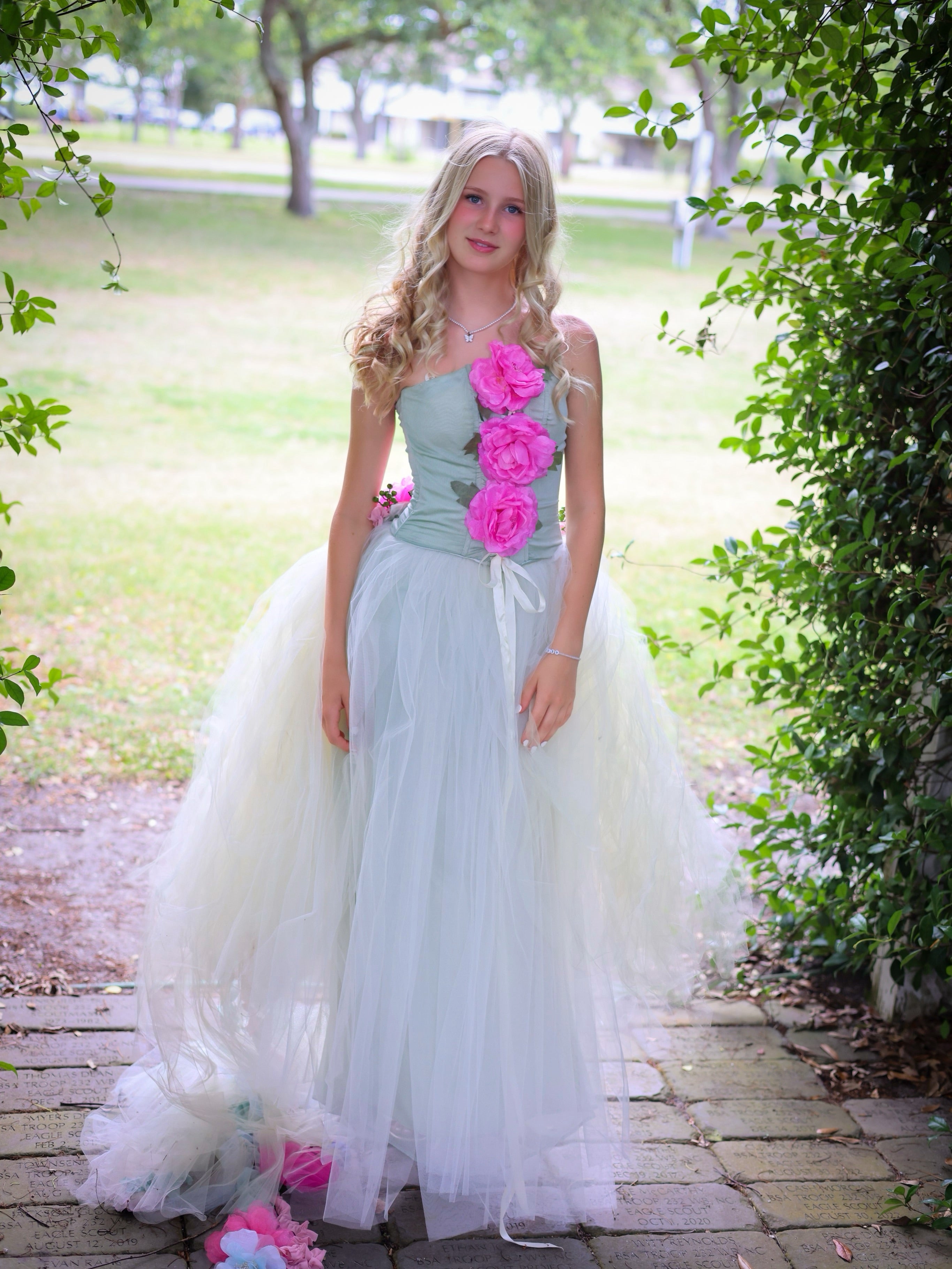 Corset set tulle skirt and detachable train hand decorated with flowers, silk strings, pearls ….. this beautiful wearable art set will make feel like a princes. Available in Ivory color for a wedding, photo shoot and more.