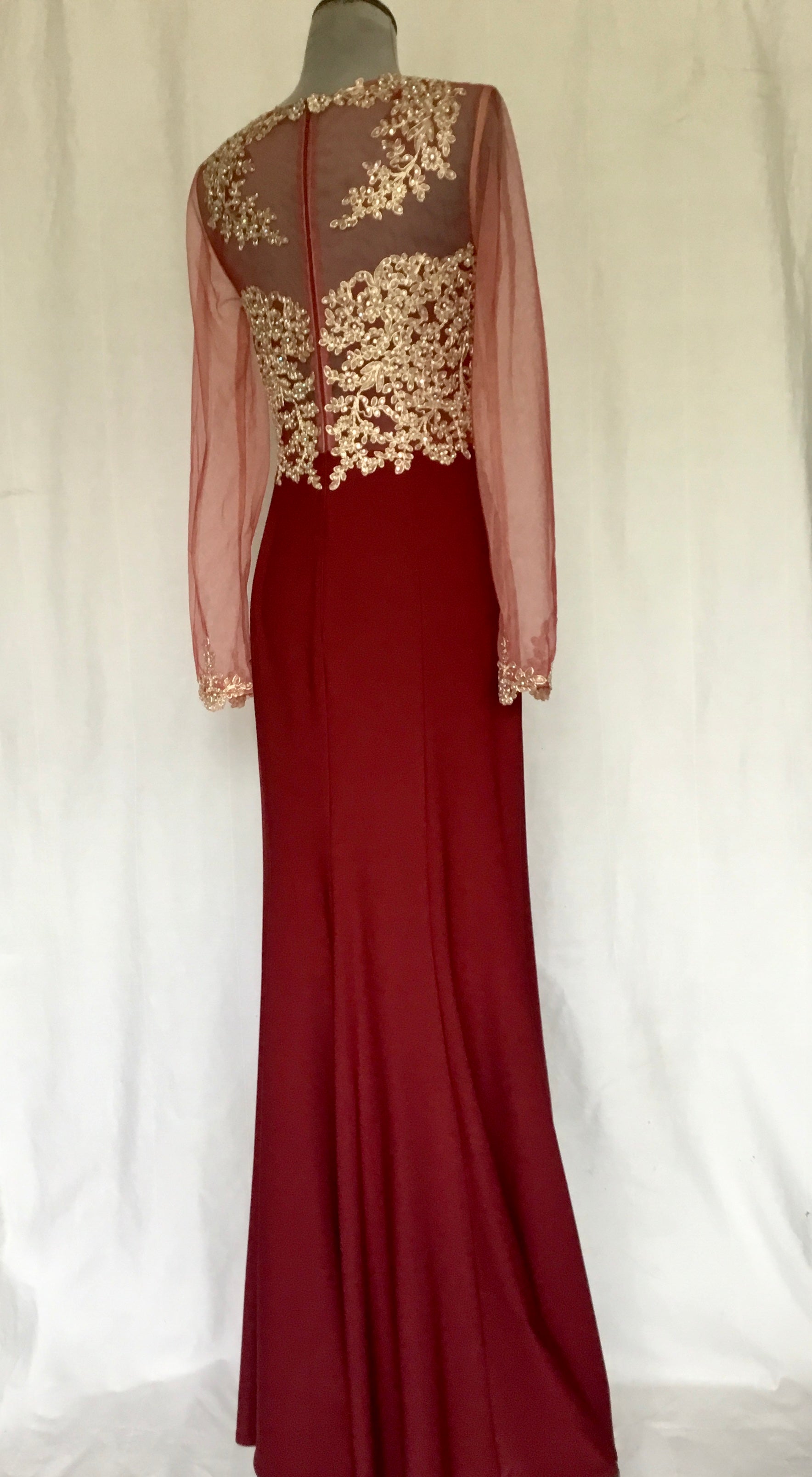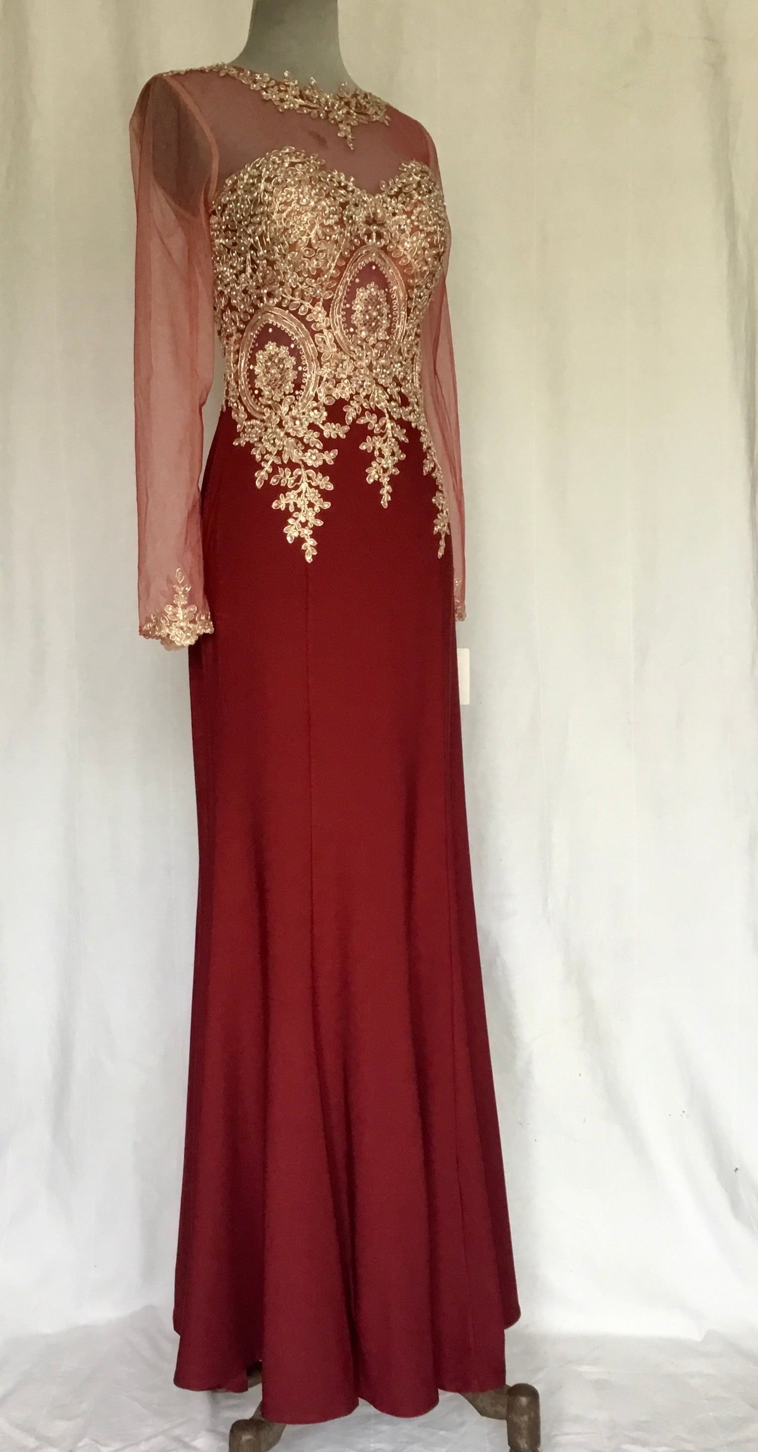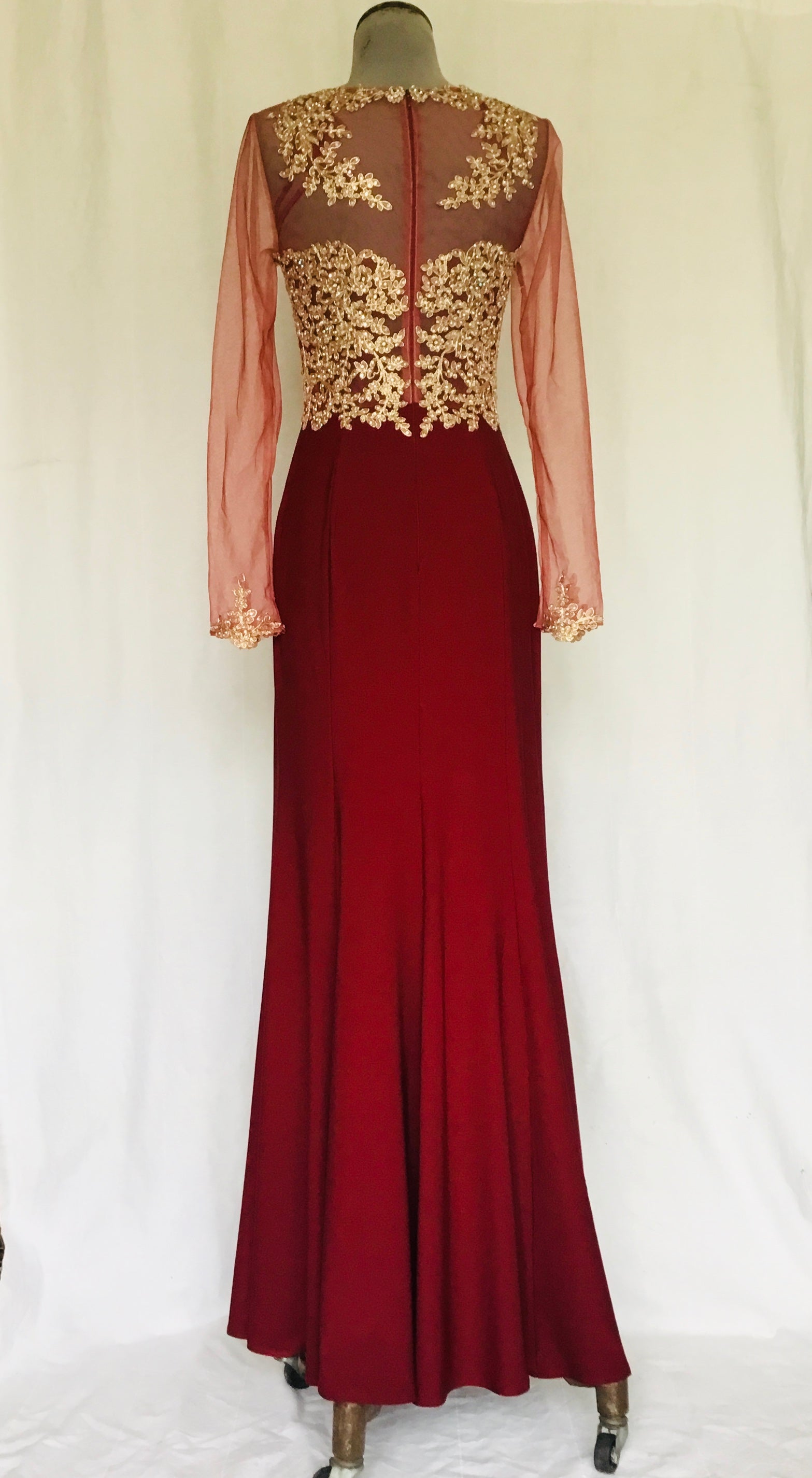 Make a conscious statement in this eco-luxury burgundy evening gown, where timeless elegance meets sustainable fashion. This floor-length stunner features a structured silhouette that flatters the figure while exuding sophistication and grace. The bodice showcases delicate gold floral embroidery over a sheer mesh yoke and sleeves, creating a regal illusion neckline and refined long sleeves that offer both modesty and allure.