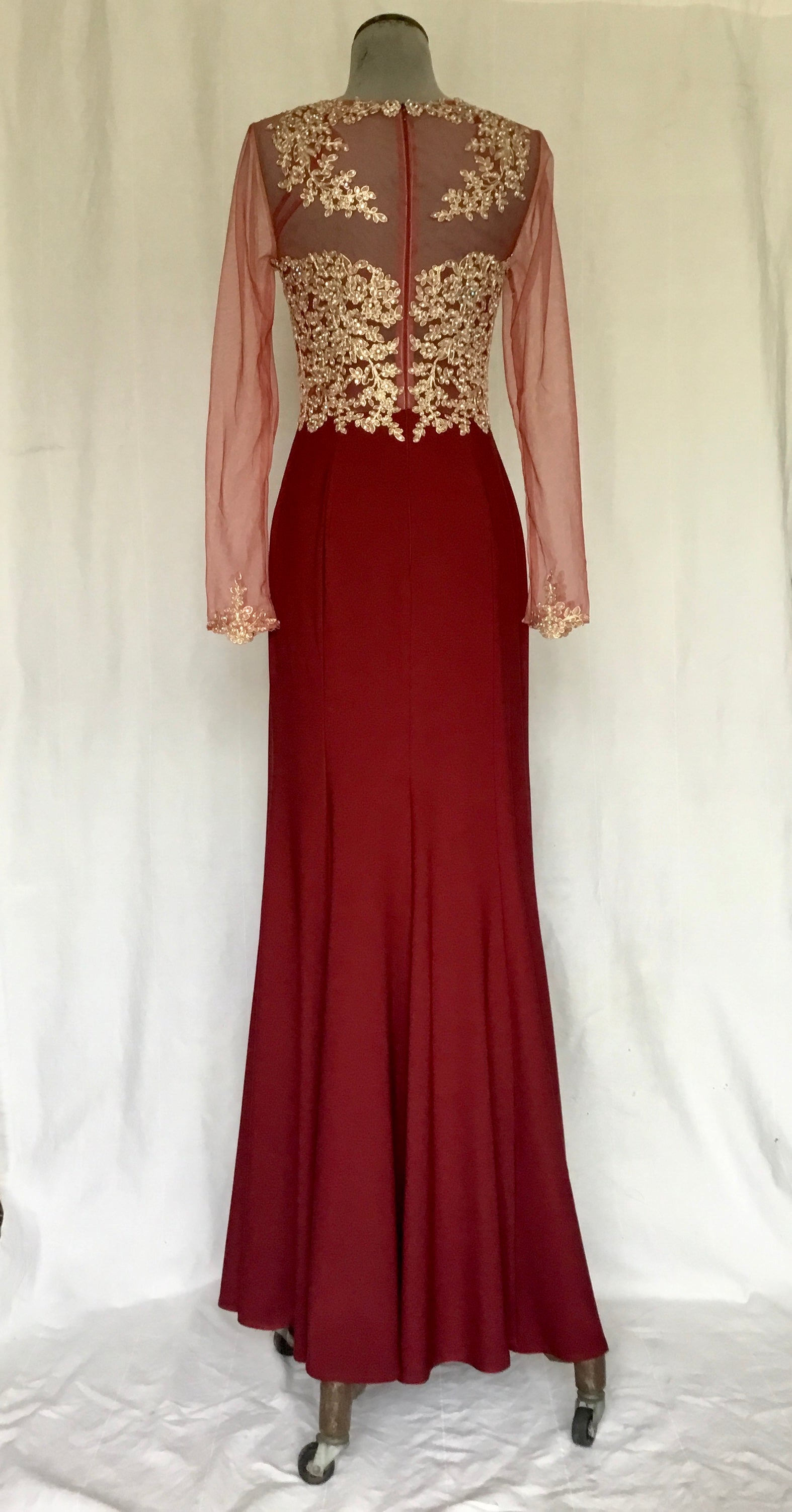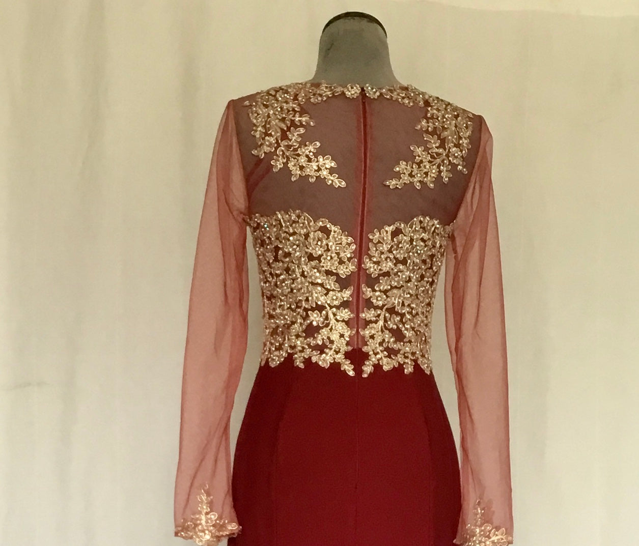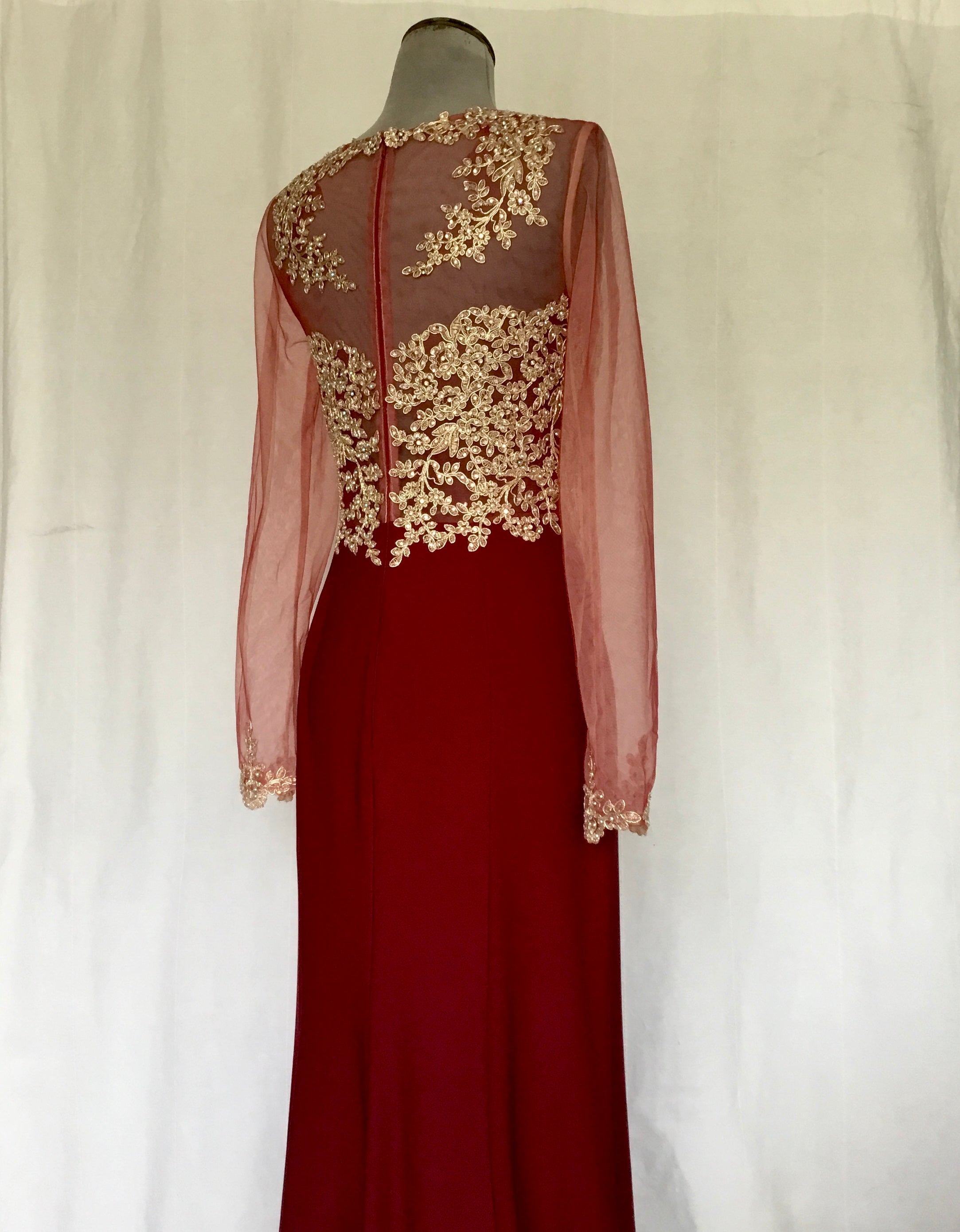 sustainable evening gown, eco-friendly formal dress, burgundy embroidered gown, ethical fashion dress, sheer long sleeve evening dress, sustainable red carpet dress, upcycled luxury dress, vintage-inspired sustainable fashion, zero-waste eveningwear, conscious fashion formal gown