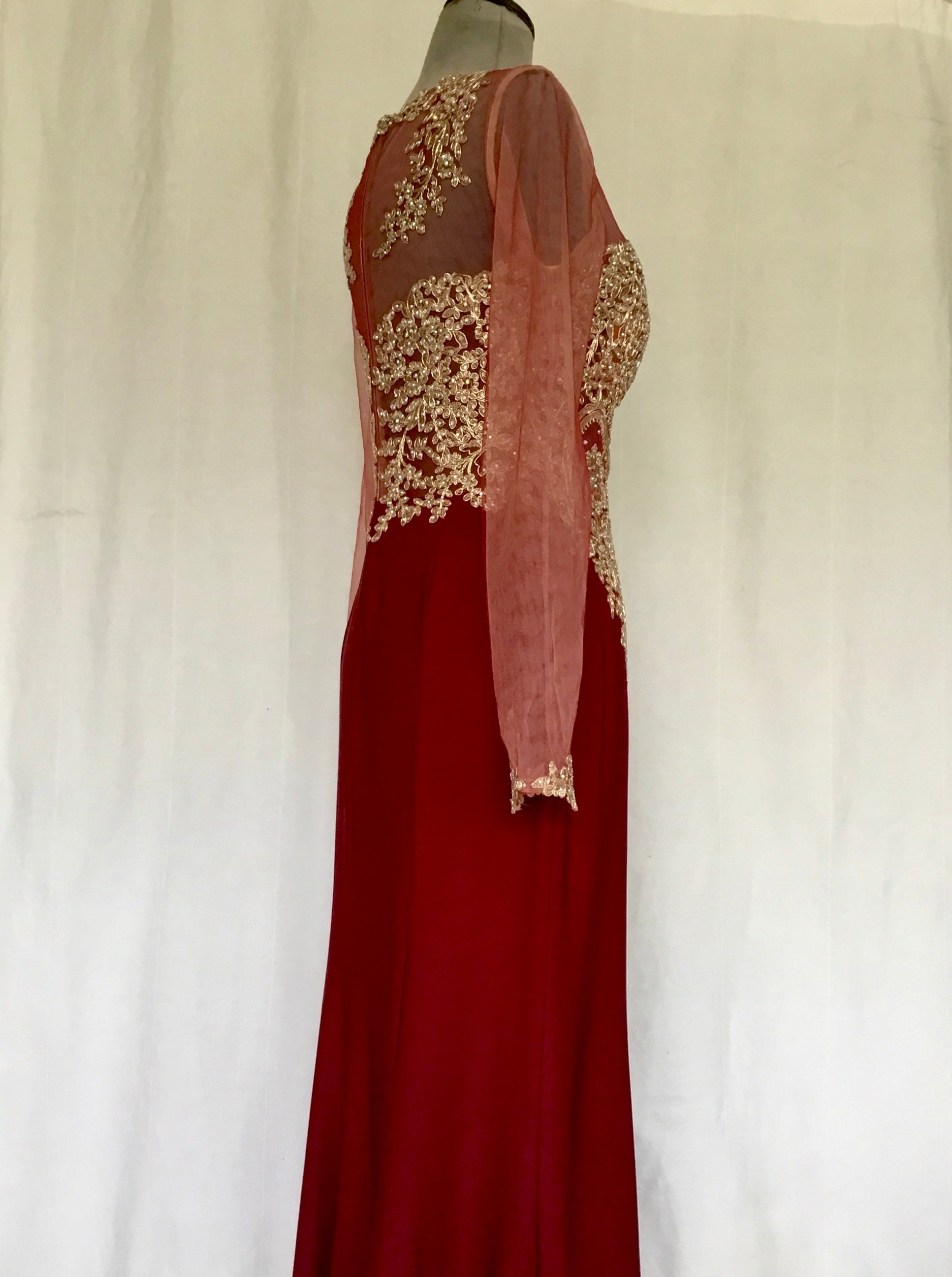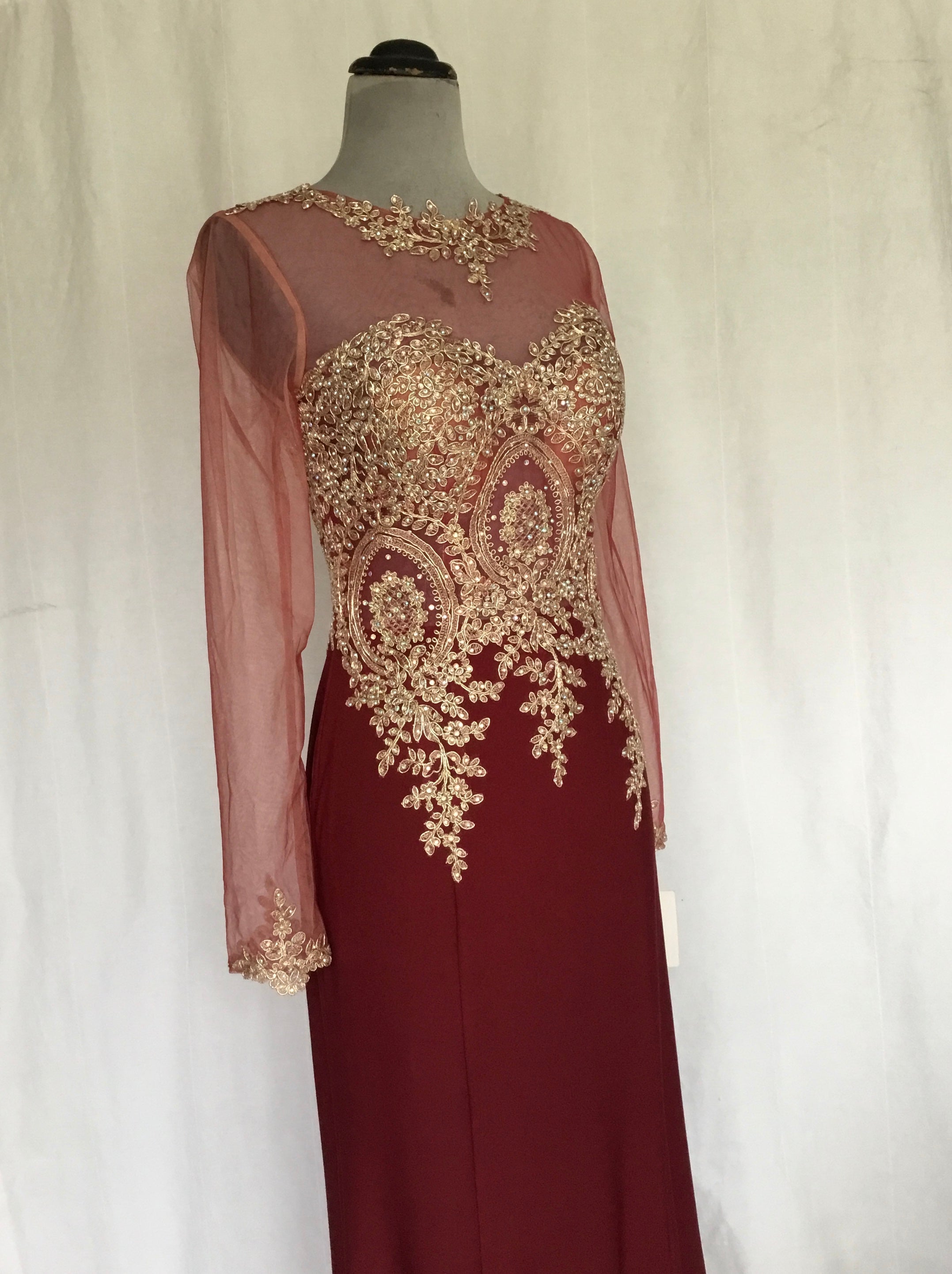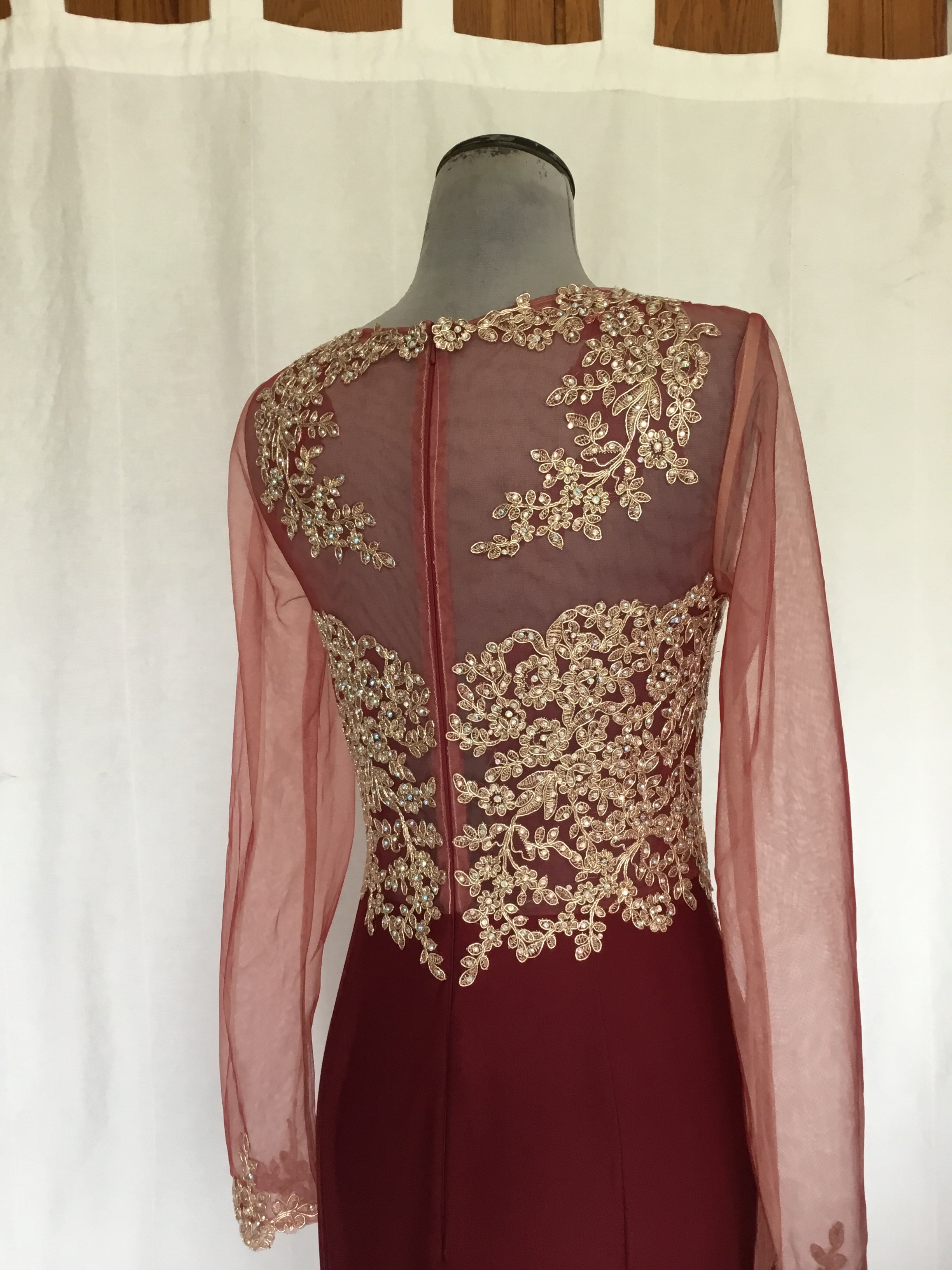 sustainable evening gown, eco-friendly formal dress, burgundy embroidered gown, ethical fashion dress, sheer long sleeve evening dress, sustainable red carpet dress, upcycled luxury dress, vintage-inspired sustainable fashion, zero-waste eveningwear, conscious fashion formal gown