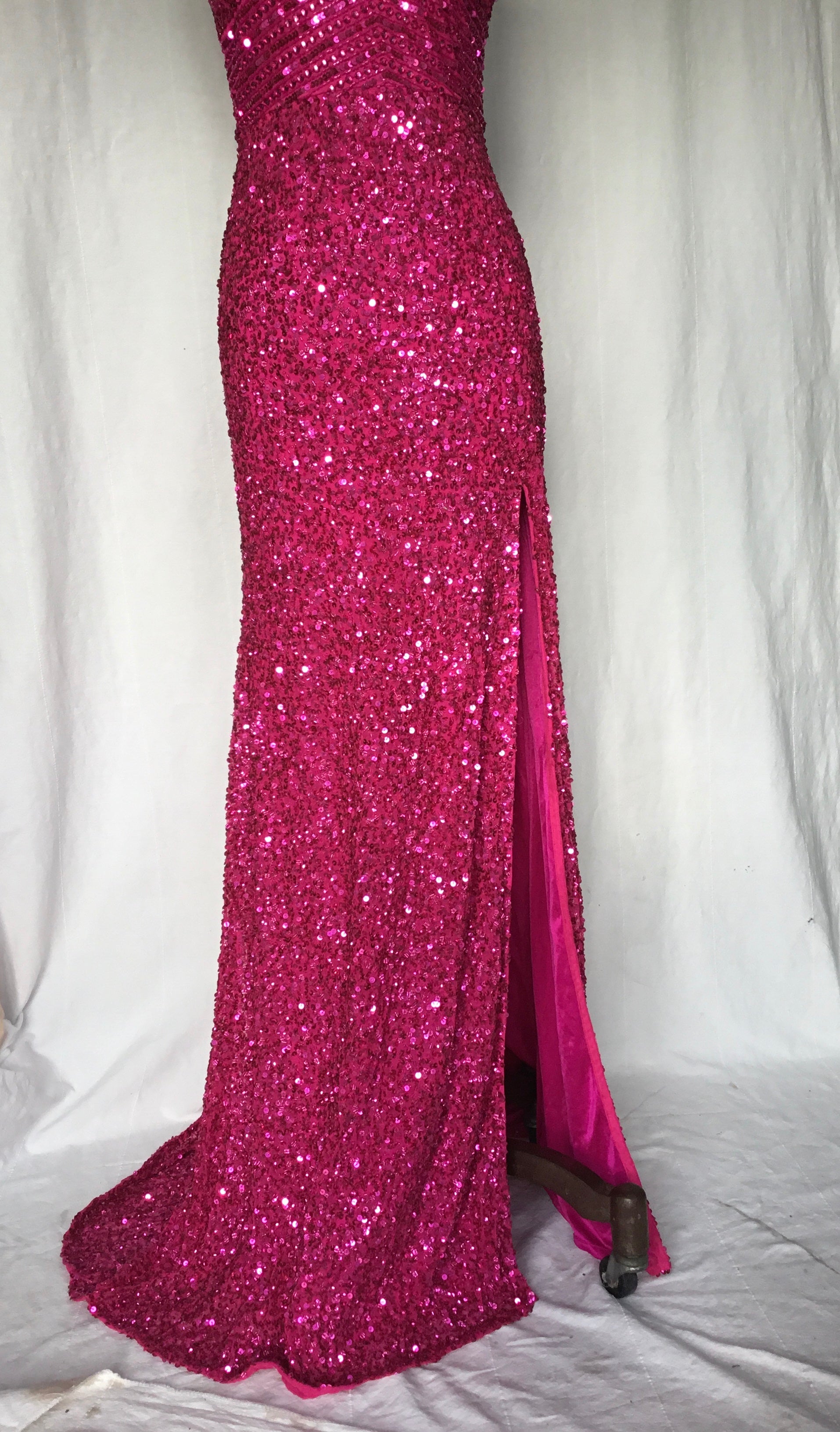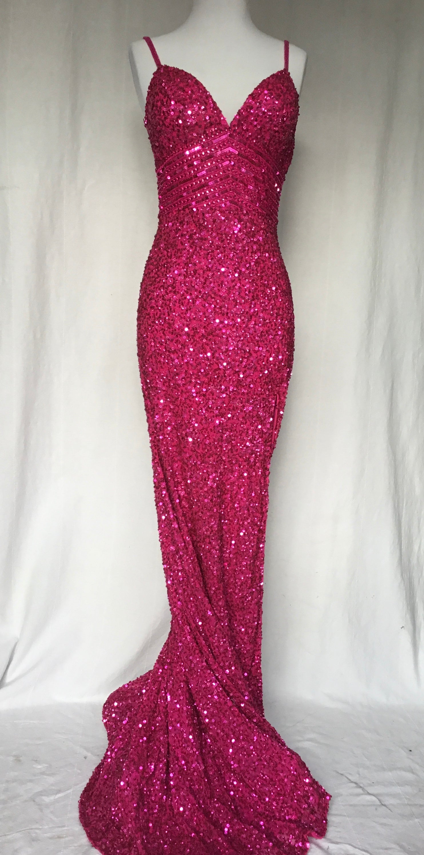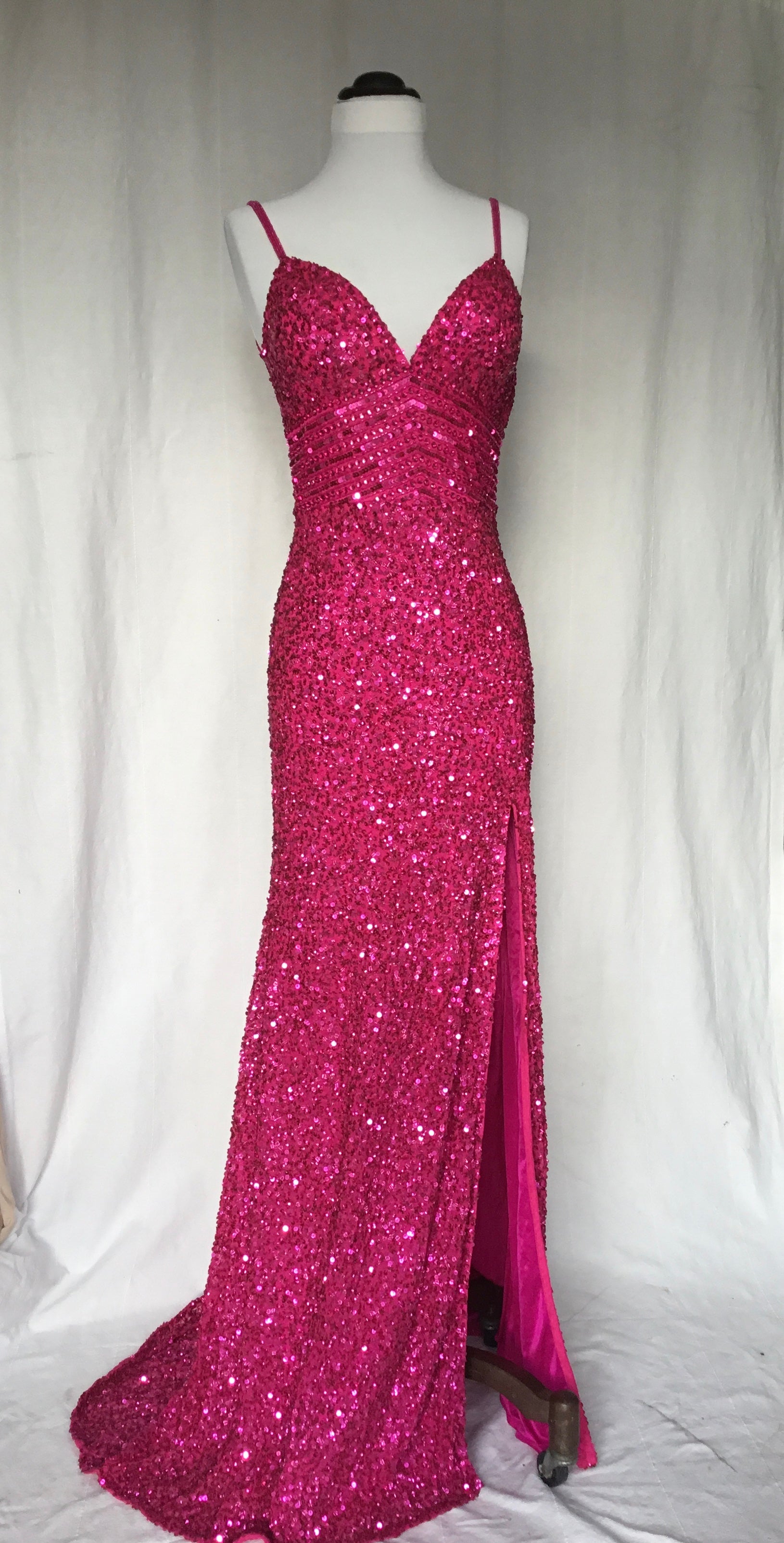 Make an unforgettable entrance in this dazzling hot pink sequin gown from the Elena Collection. Designed to captivate, this form-fitting evening dress features a flattering sweetheart neckline, delicate spaghetti straps, and intricate sequin embellishments throughout. The sculpted bodice cinches at the waist with a chevron sequin pattern for added definition, while the thigh-high slit offers a bold touch of drama.