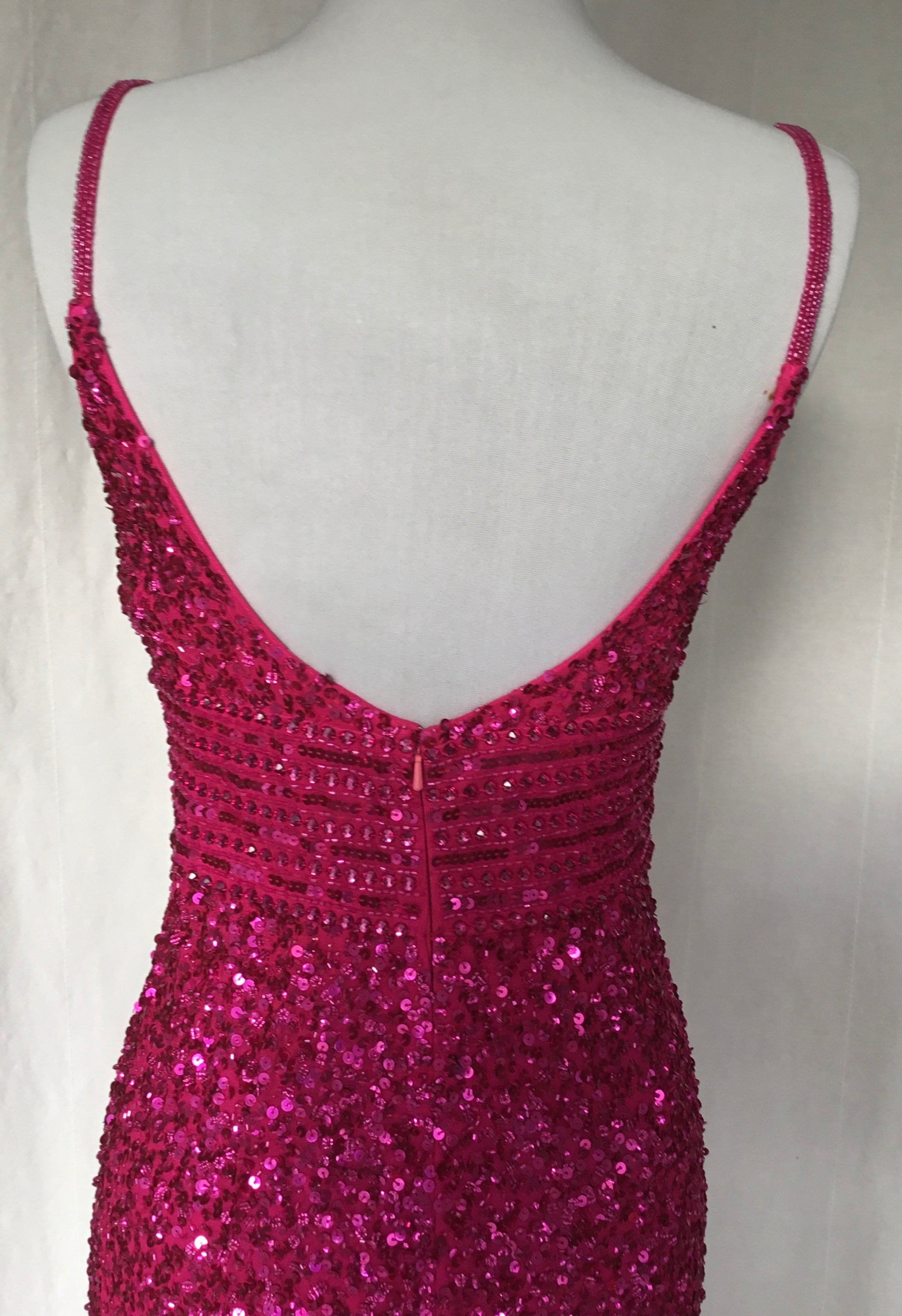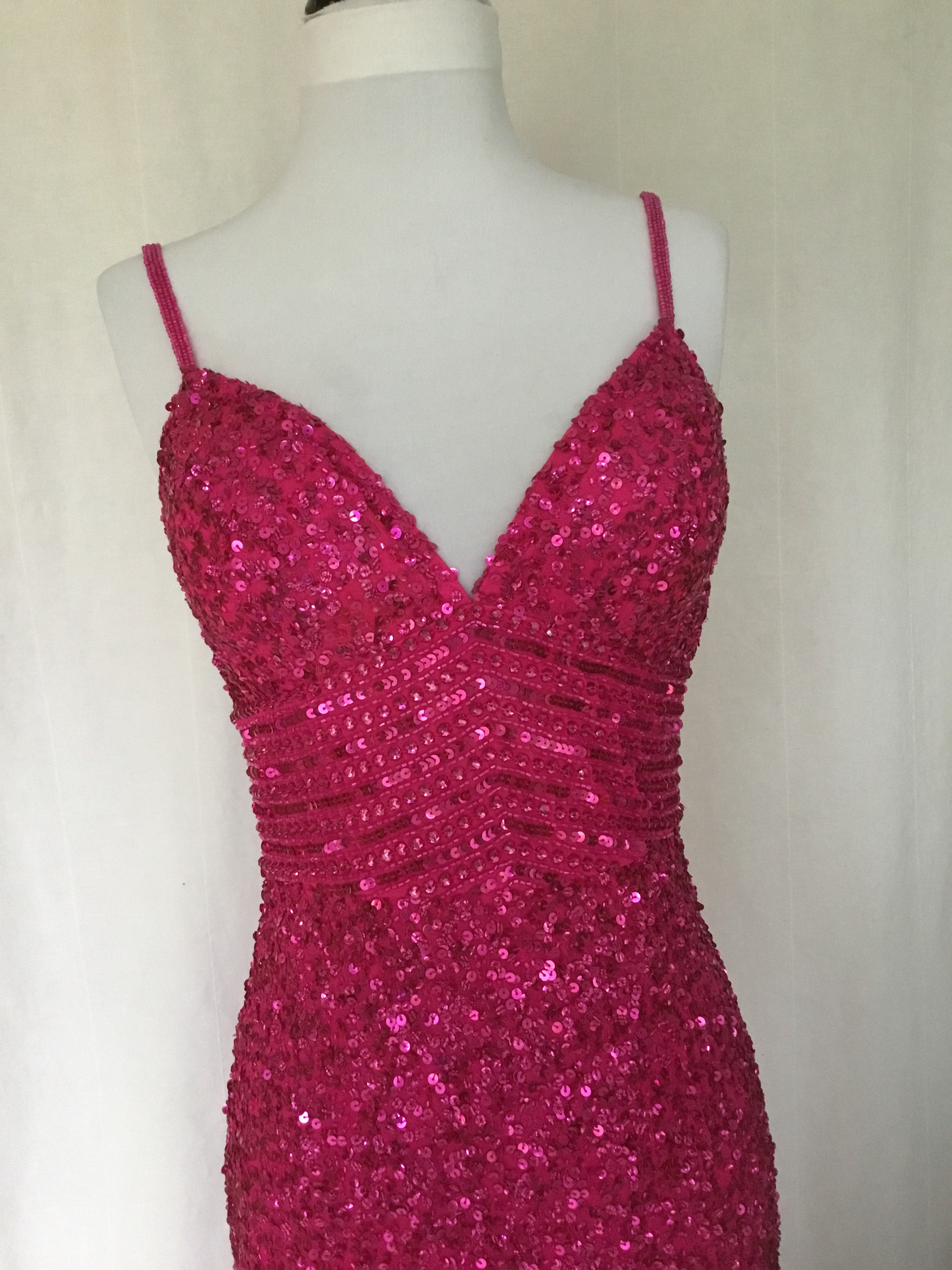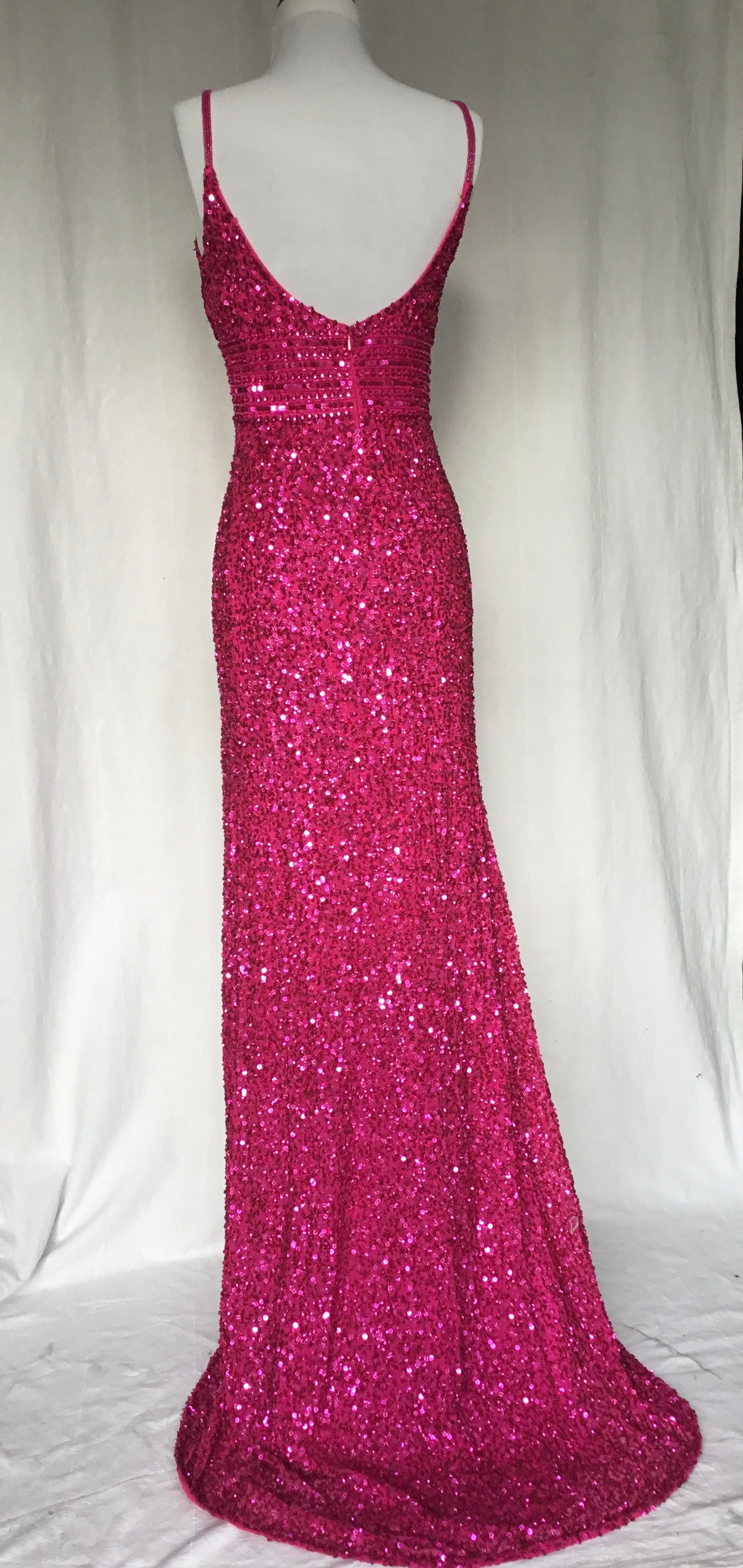 Make an unforgettable entrance in this dazzling hot pink sequin gown from the Elena Collection. Designed to captivate, this form-fitting evening dress features a flattering sweetheart neckline, delicate spaghetti straps, and intricate sequin embellishments throughout. The sculpted bodice cinches at the waist with a chevron sequin pattern for added definition, while the thigh-high slit offers a bold touch of drama.