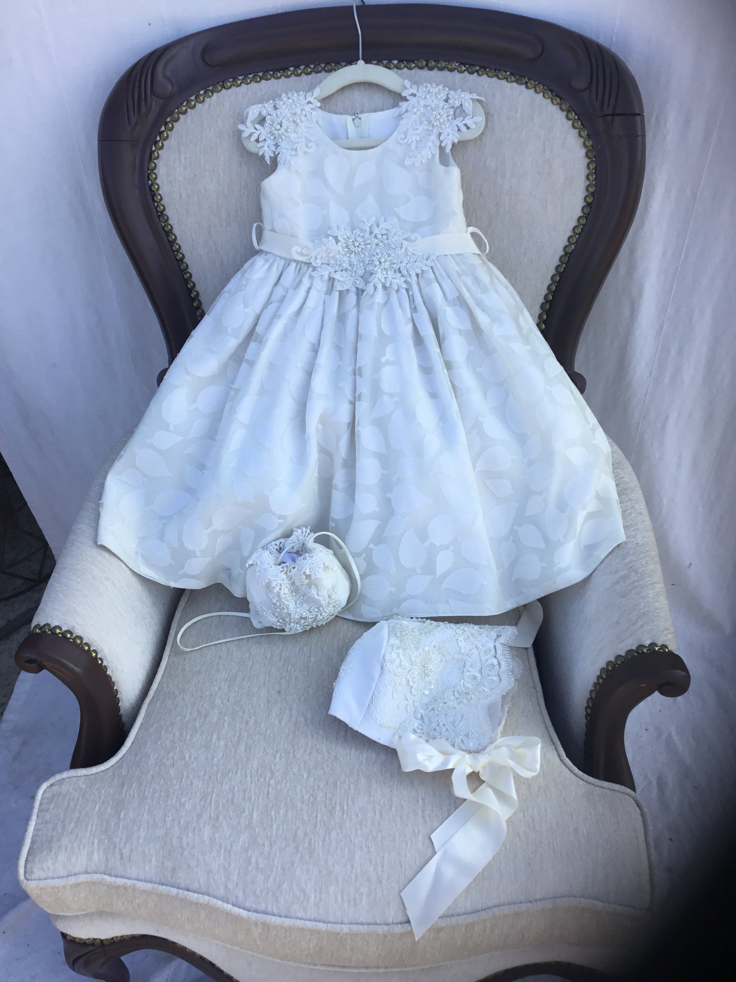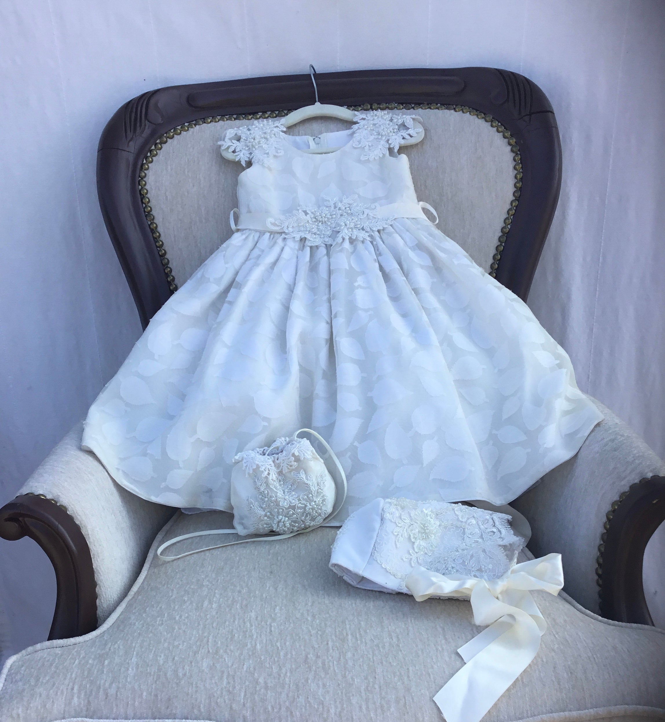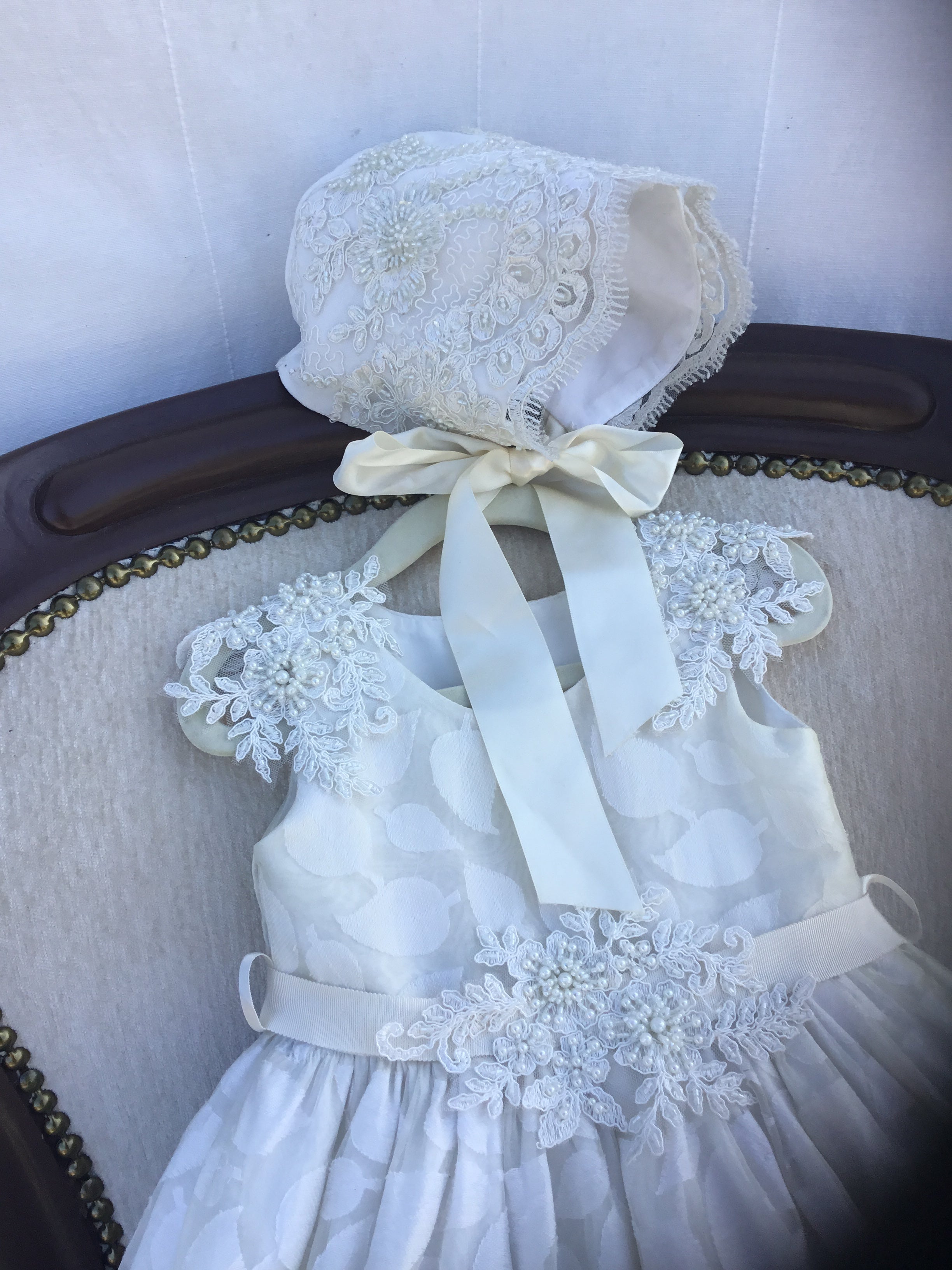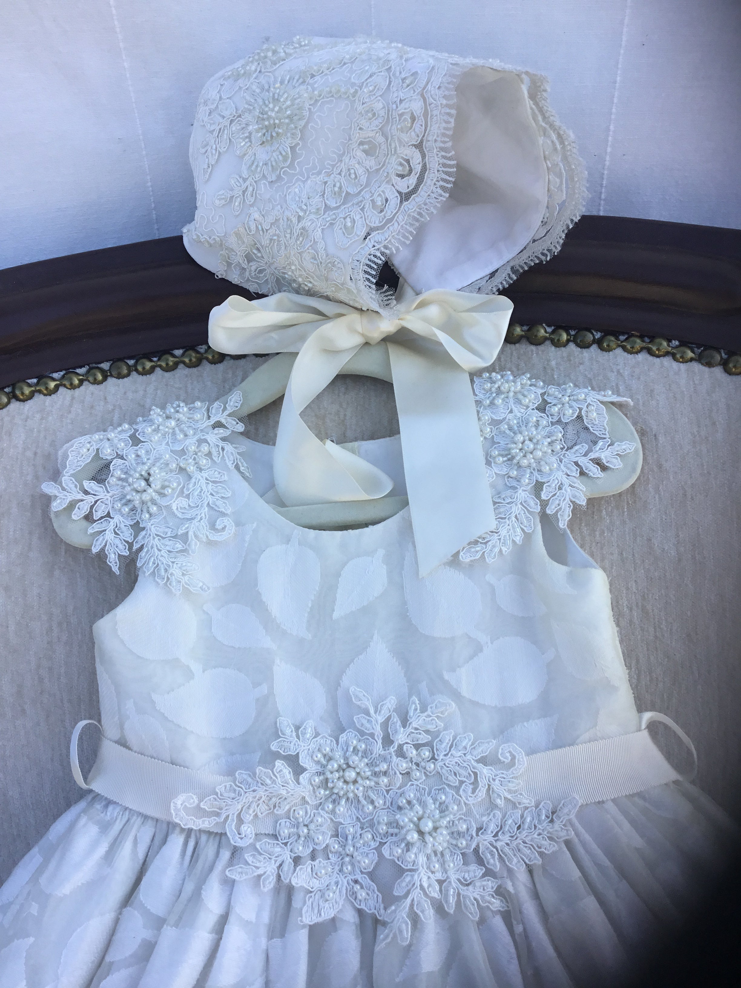 Silk Organza Toddler Baptism Dress with Hand-Sewn Lace Appliqués & Bonnet