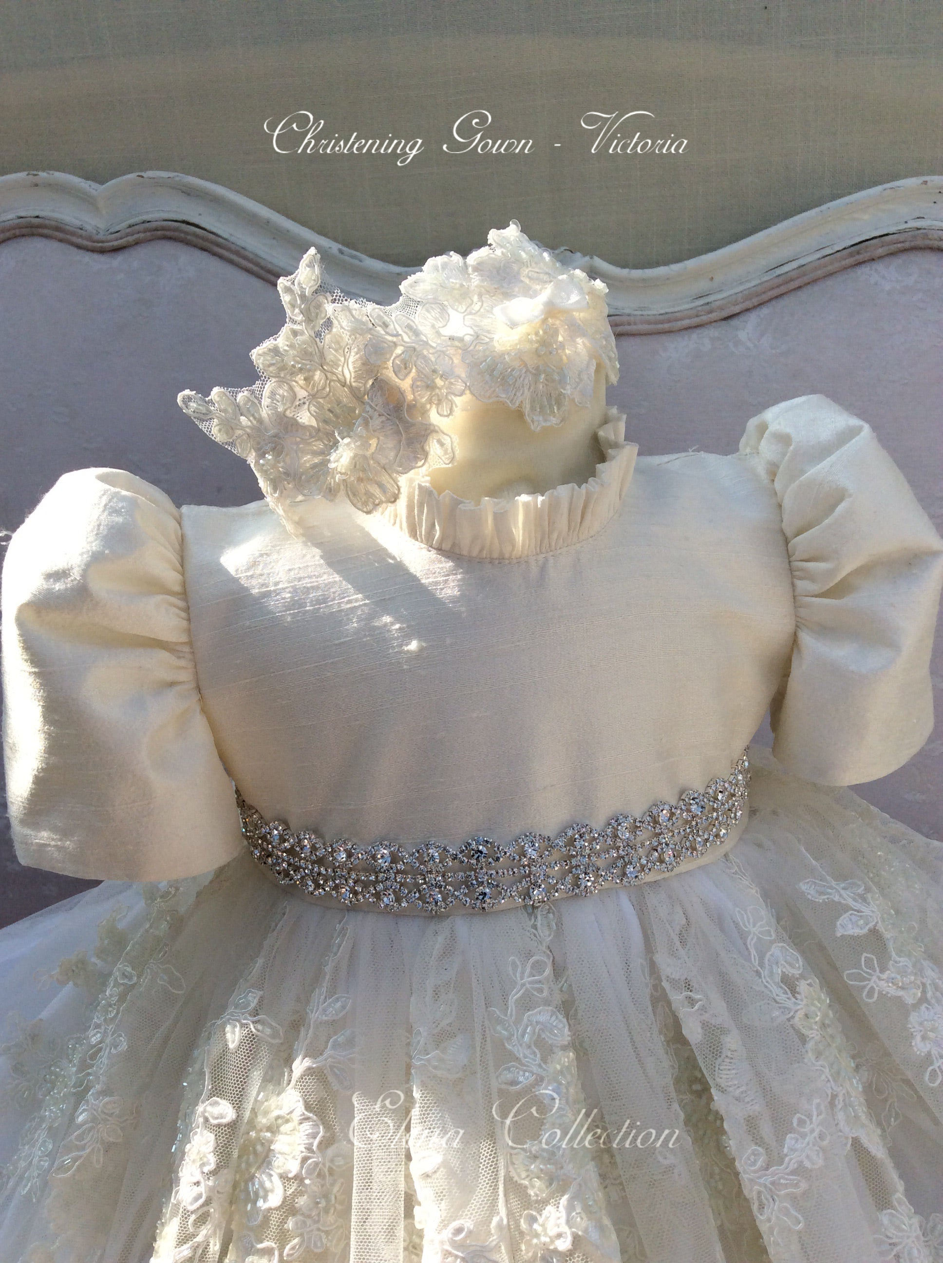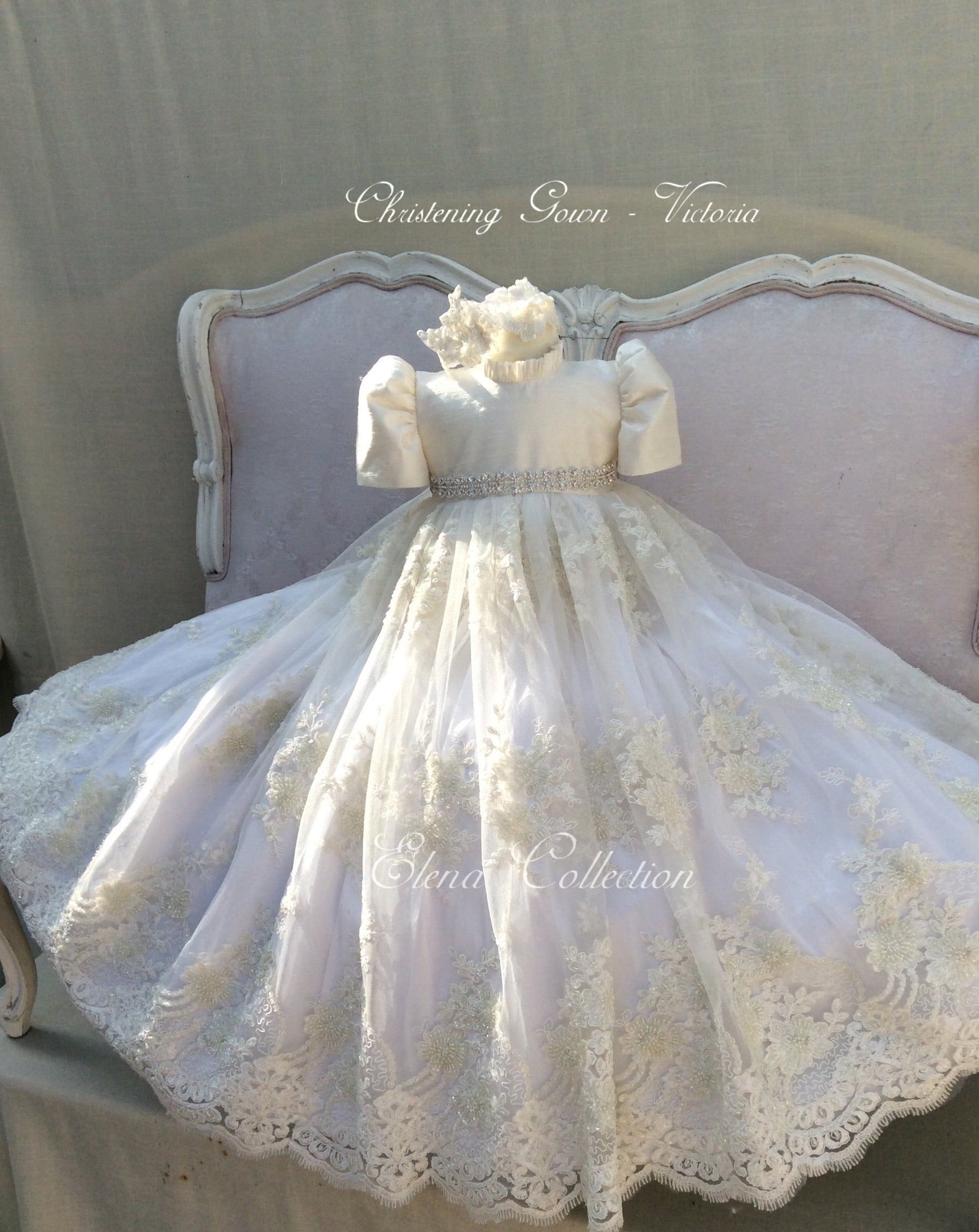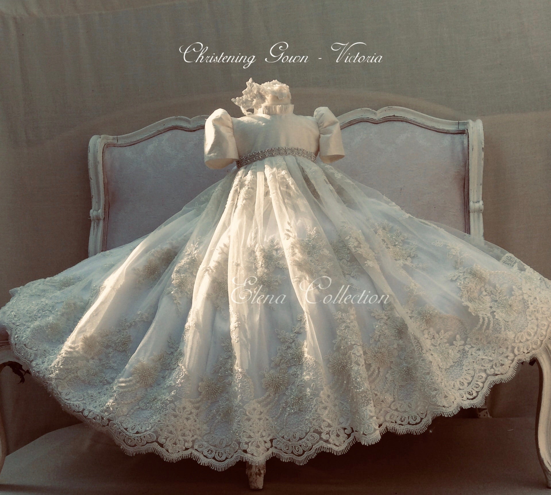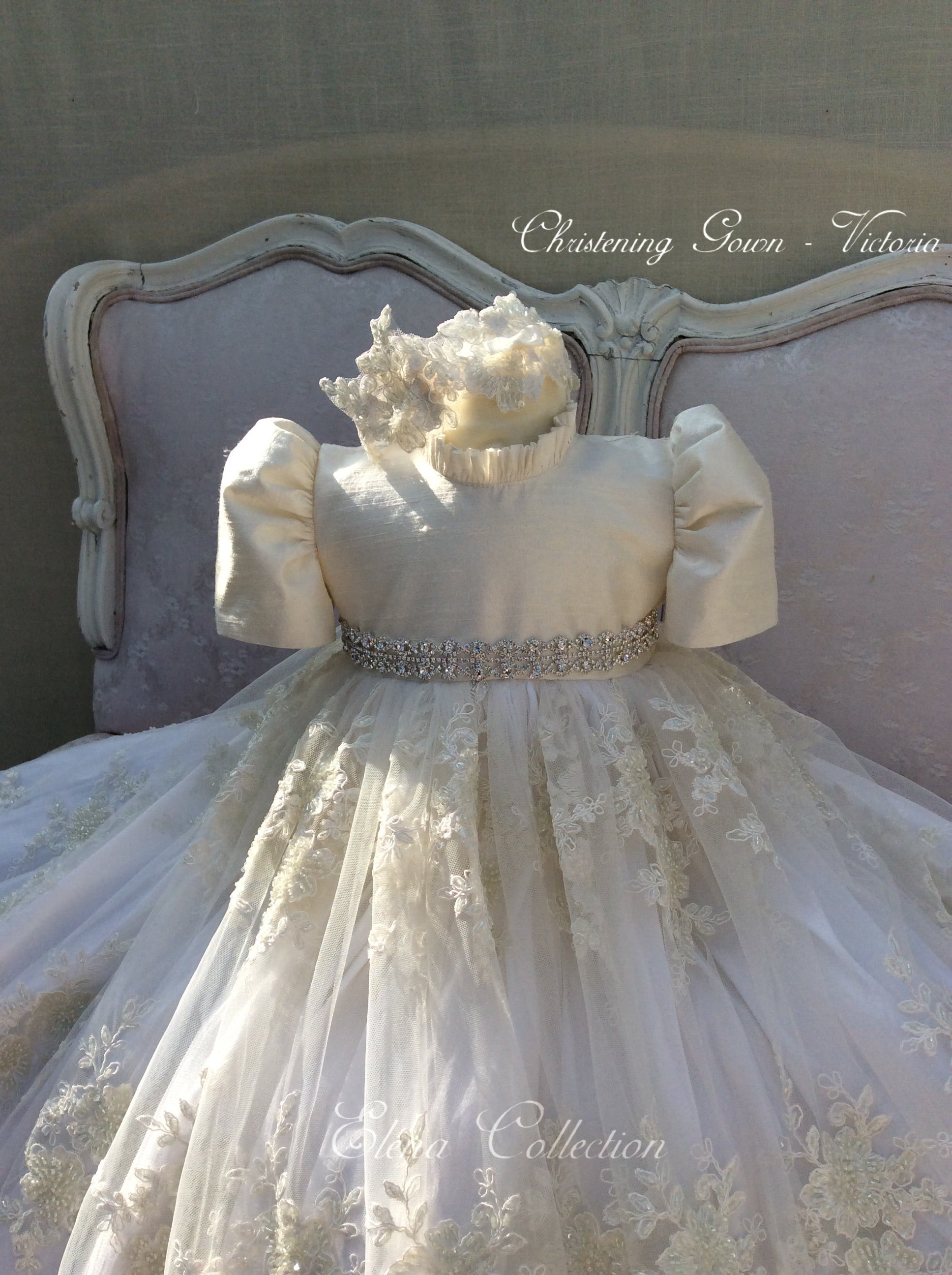 Victoria is a luxurious Victorian-inspired Christening gown featuring a Royal neckline, silk sleeves, and a 90” wide overlay skirt with a scalloped, hand-beaded lace hem. Fully lined with added crinoline for elegant fullness. Accessories sold separately. Fabrics and details: • Silk sleeves • Hand-beaded lace • Embroidered scalloped hem • Fully lined with crinoline for volume Please note, beads may loosen naturally due to hand beading. Always supervise your child while wearing this heirloom gown.