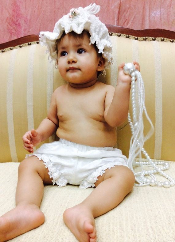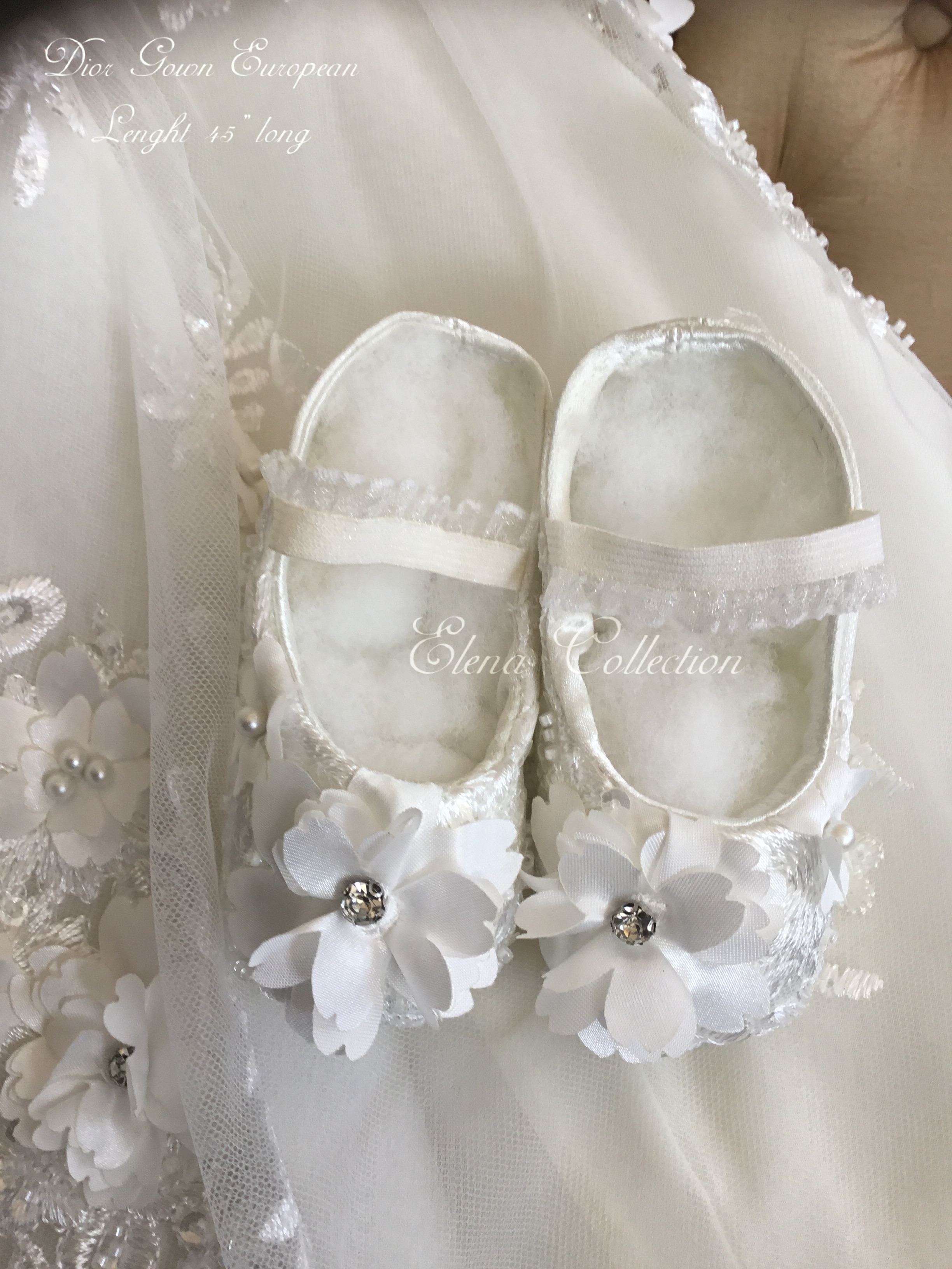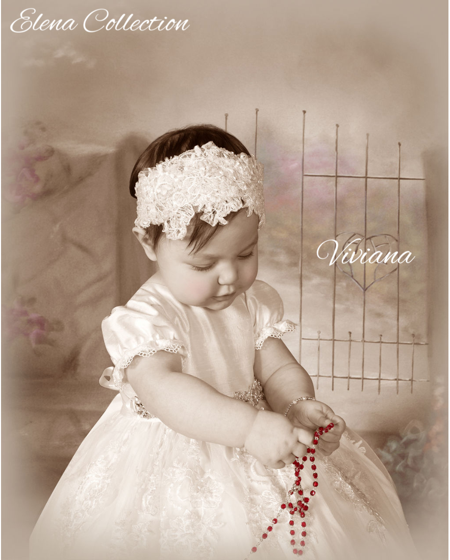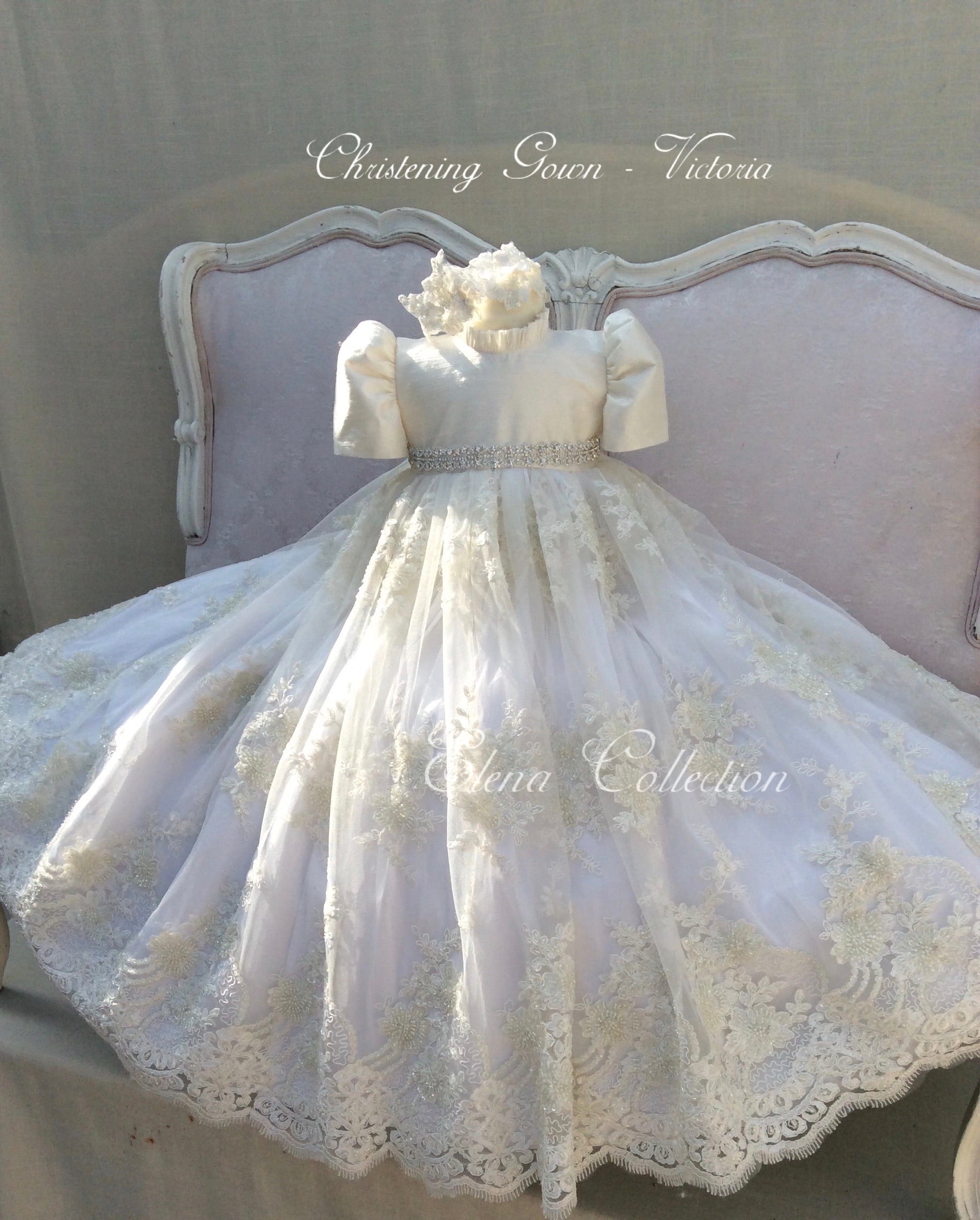 Victoria is a luxurious Victorian-inspired Christening gown featuring a Royal neckline, silk sleeves, and a 90” wide overlay skirt with a scalloped, hand-beaded lace hem. Fully lined with added crinoline for elegant fullness. Accessories sold separately. Fabrics and details: • Silk sleeves • Hand-beaded lace • Embroidered scalloped hem • Fully lined with crinoline for volume Please note, beads may loosen naturally due to hand beading. Always supervise your child while wearing this heirloom gown.