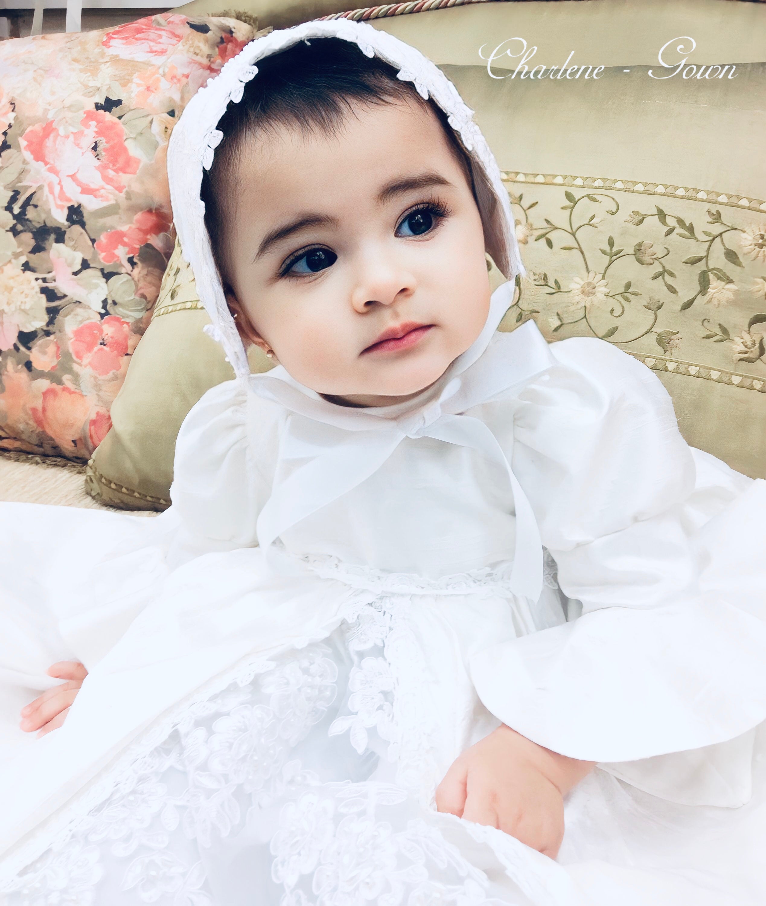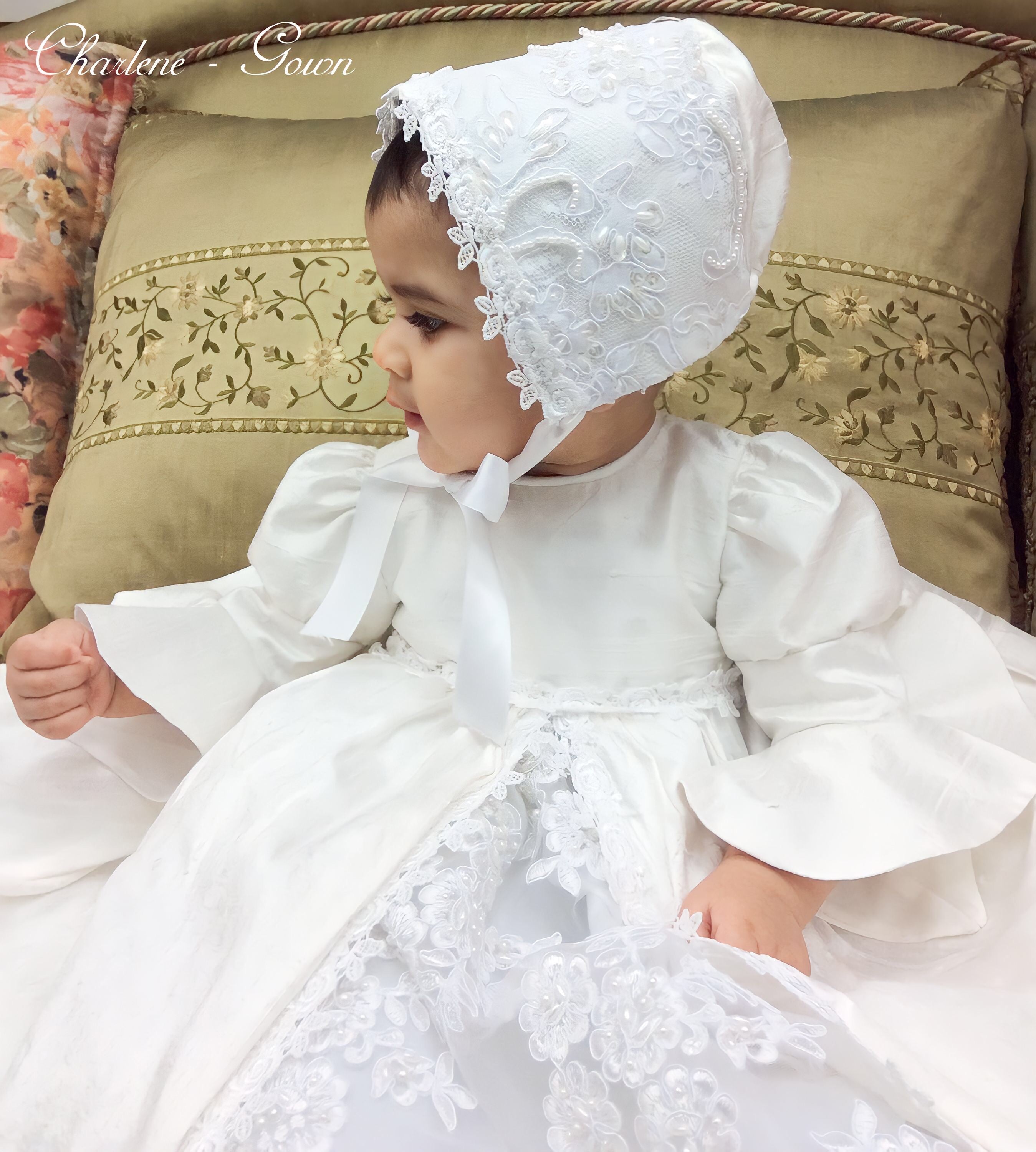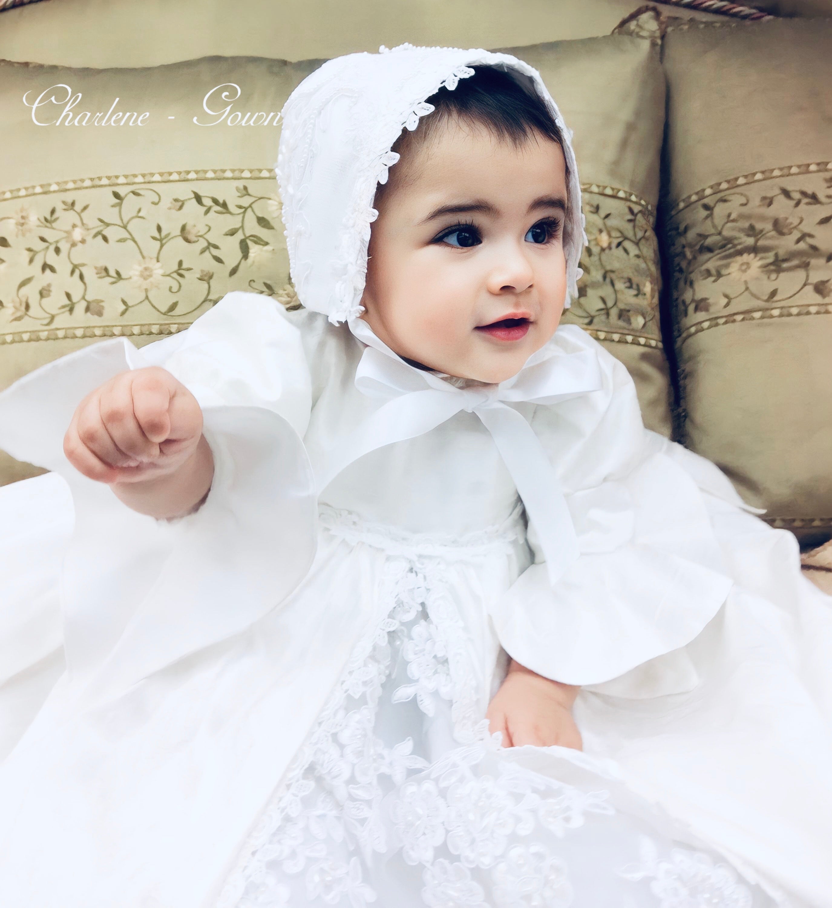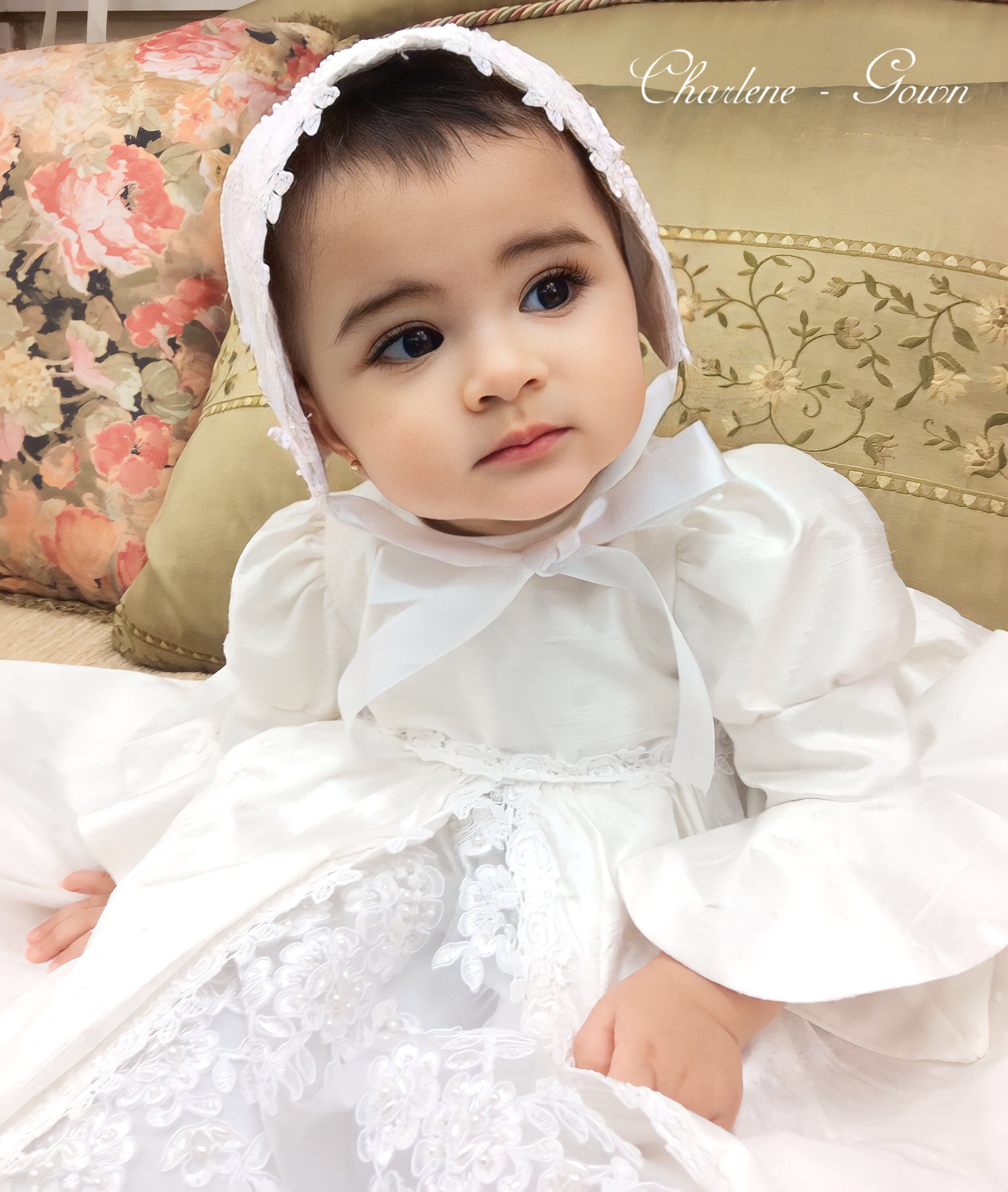 The Charlene christening gown is a handmade, luxurious gown silk and delicate beading lace with Victorian sleeves. It includes a soft cotton lining and matching bonnet for comfort. Crafted in California from fine soft lining , lace, and trims, it’s designed for a perfect fit on your baby’s special day. Optional lace shoes and silk bloomers add to this elegant heirloom. Choose our matching bundle to complete the victorian look