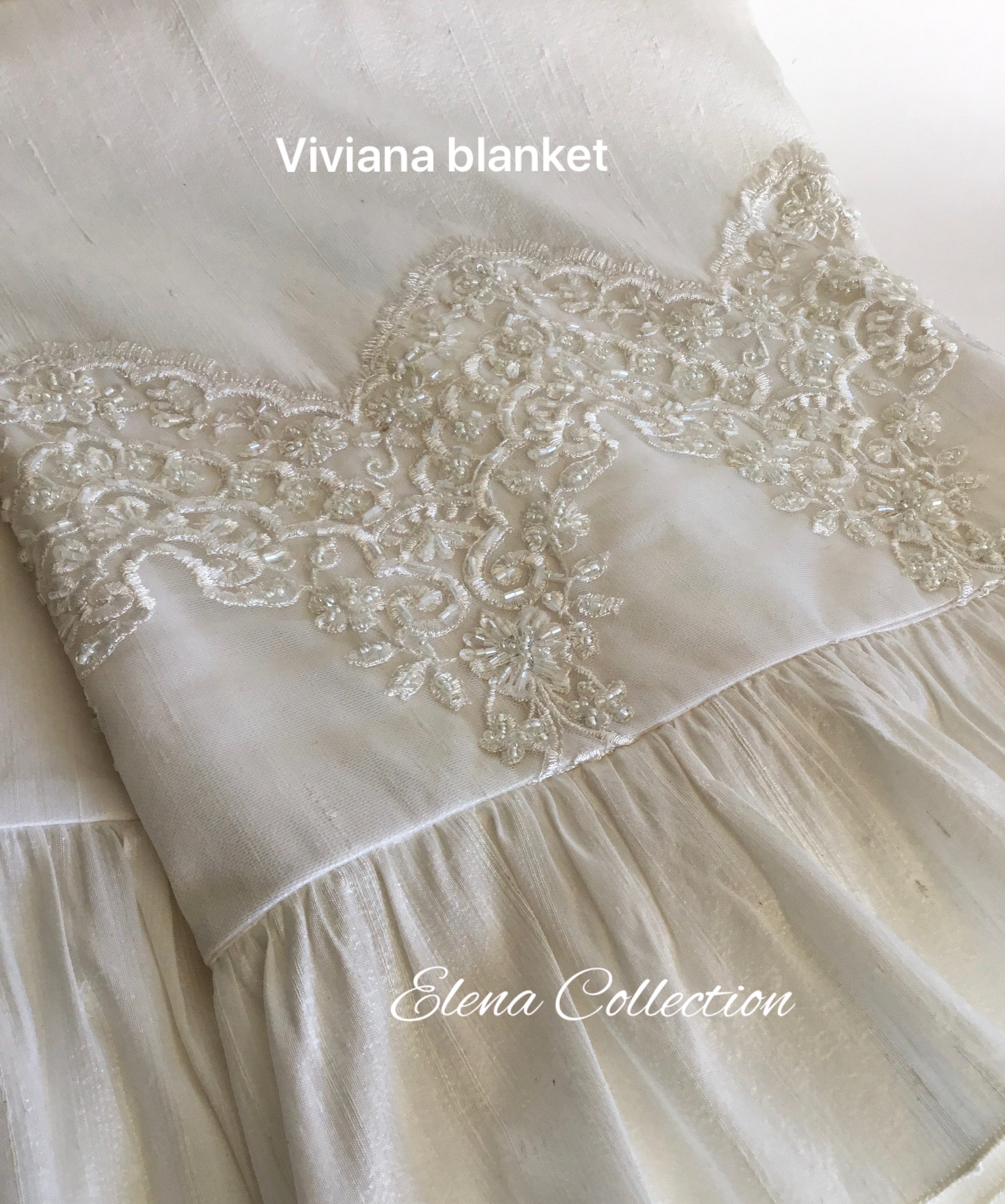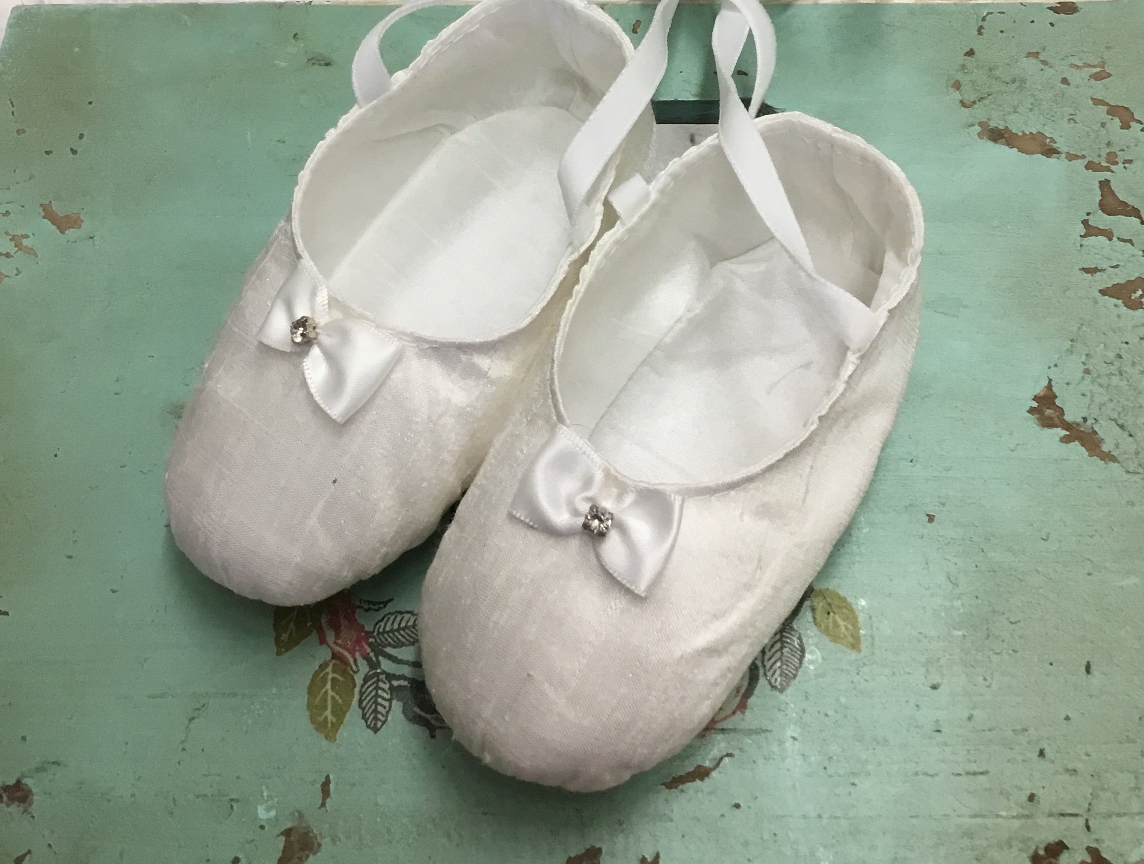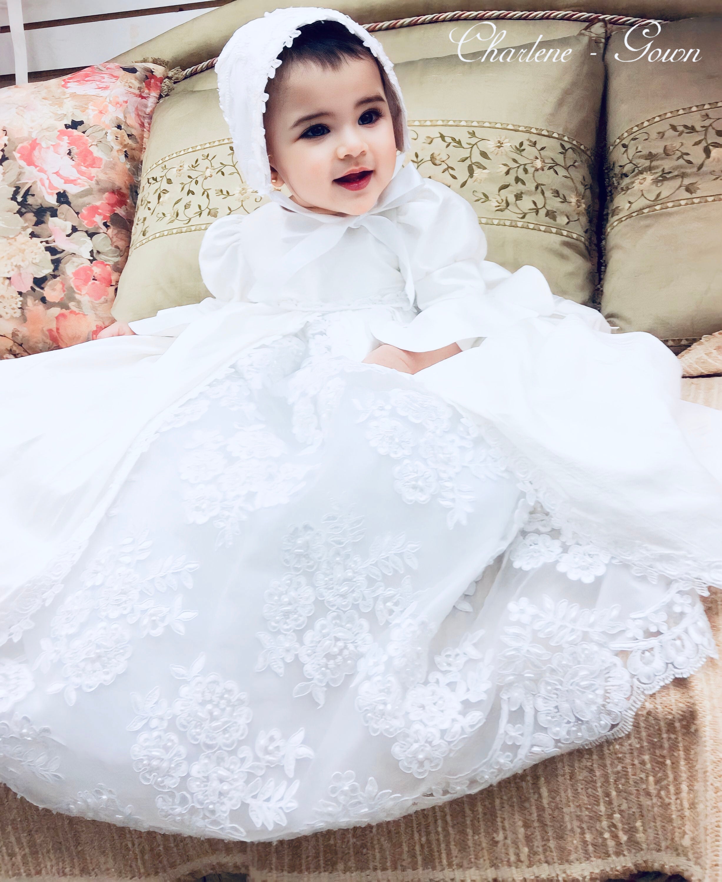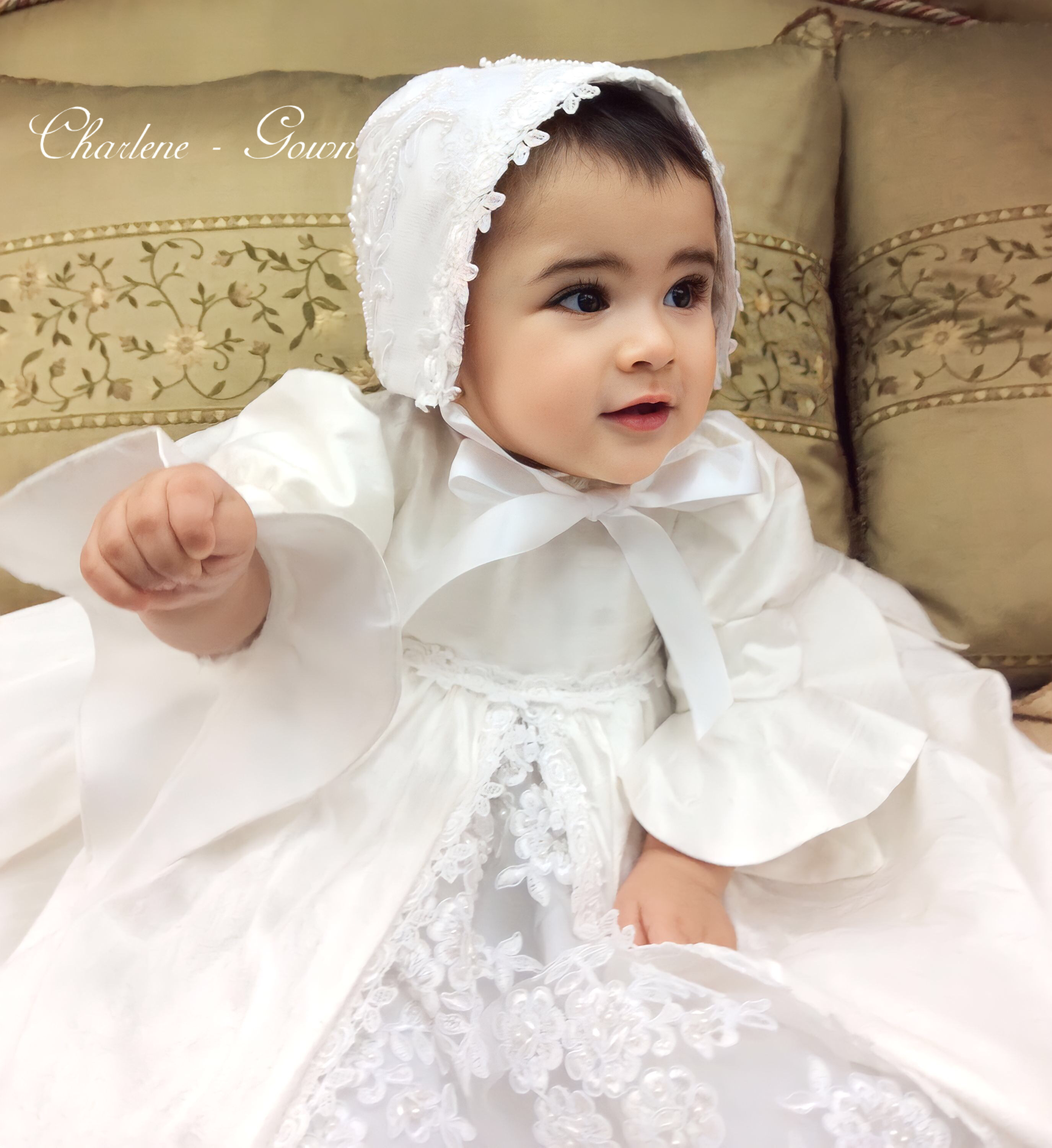 The Charlene christening gown is a handmade, luxurious gown silk and delicate beading lace with Victorian sleeves. It includes a soft cotton lining and matching bonnet for comfort. Crafted in California from fine soft lining , lace, and trims, it’s designed for a perfect fit on your baby’s special day. Optional lace shoes and silk bloomers add to this elegant heirloom. Choose our matching bundle to complete the victorian look