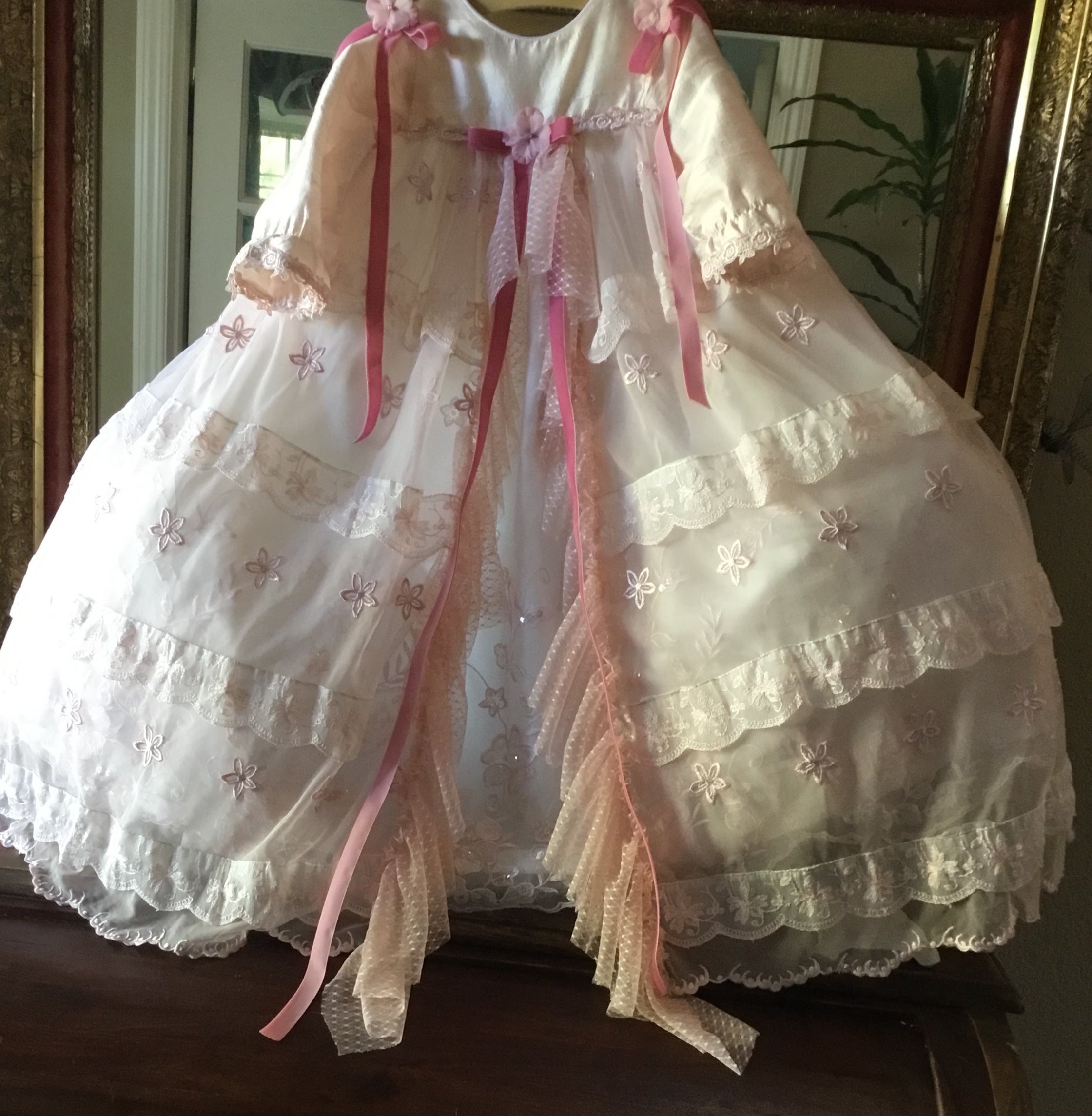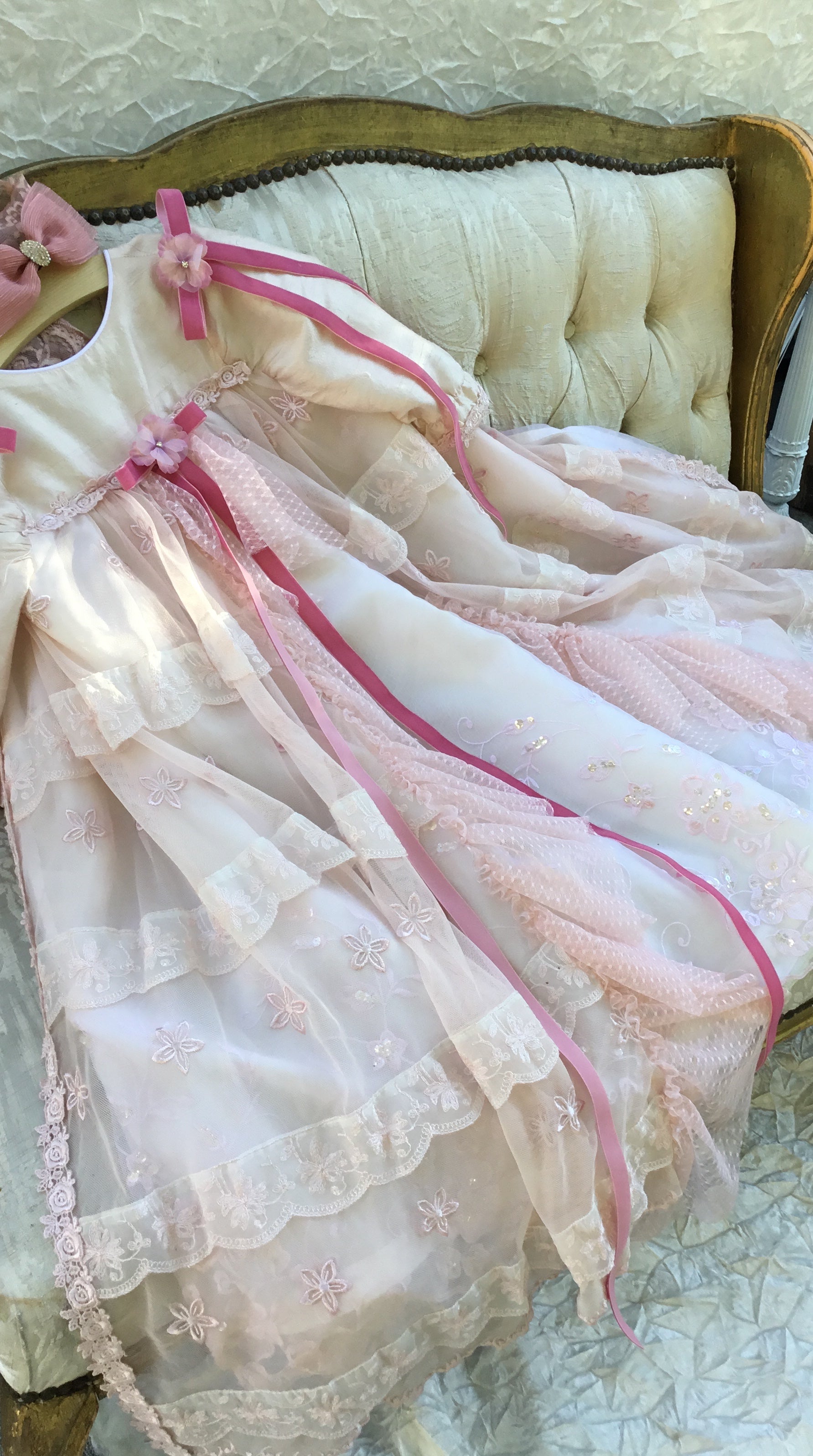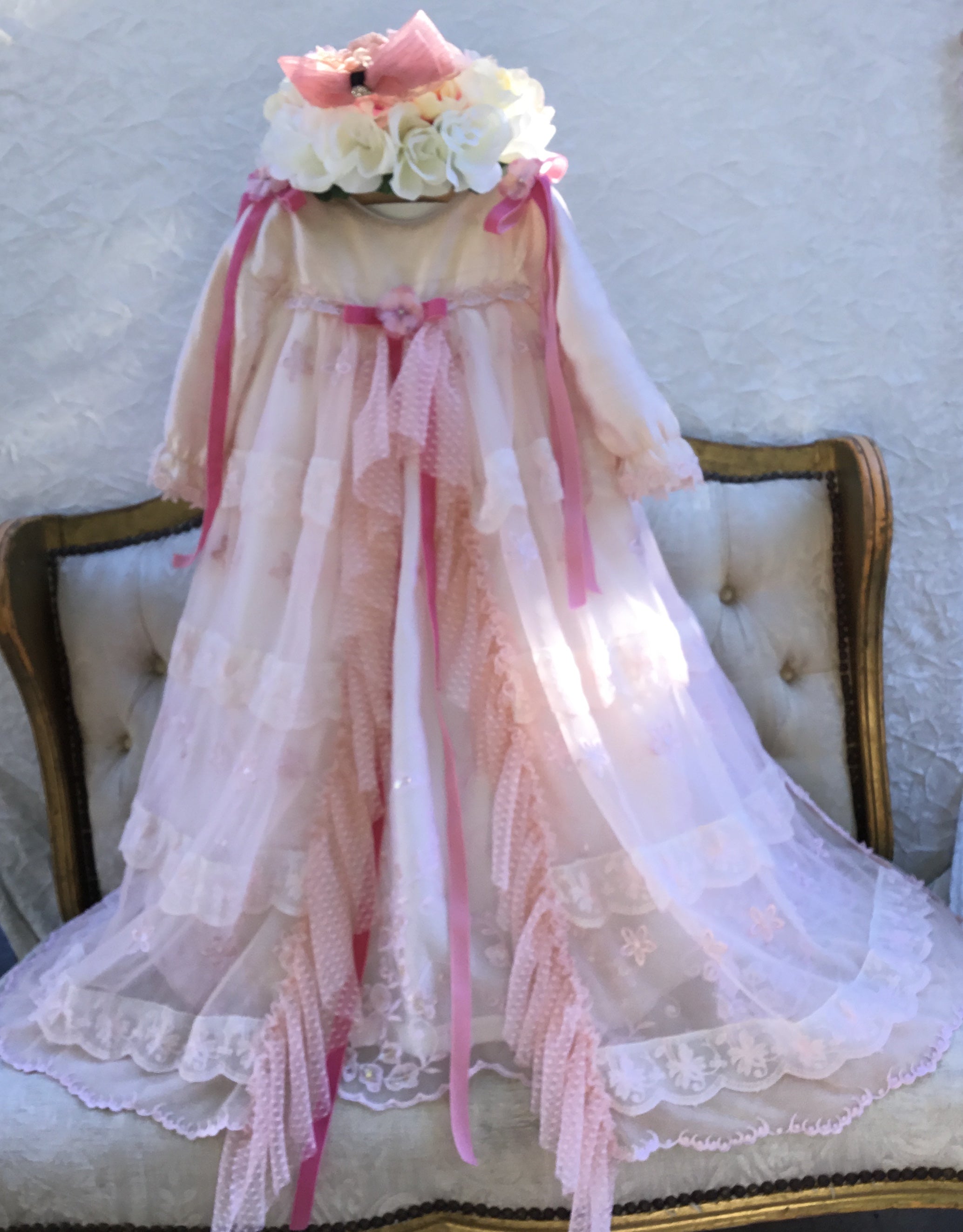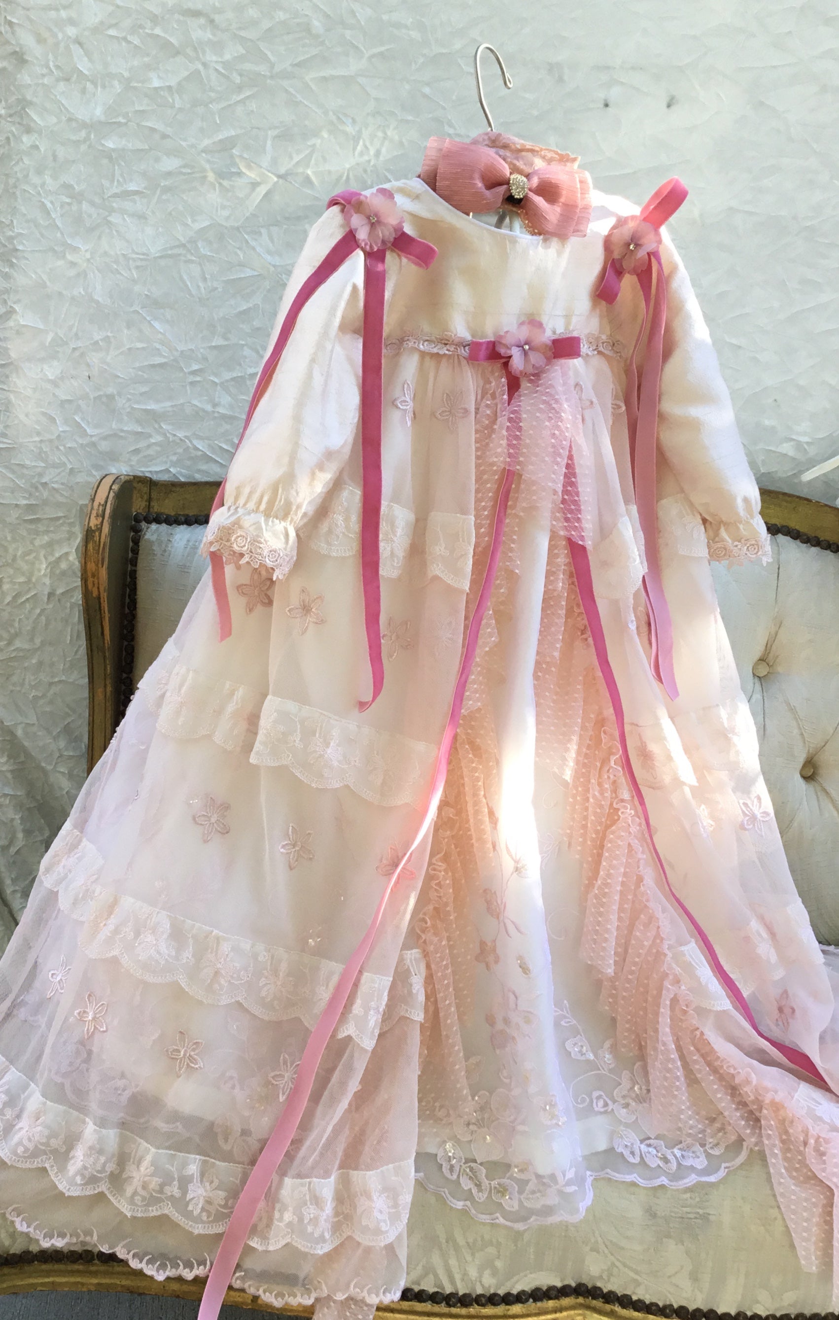 Blush is an exceptional christening gown that epitomizes luxury and timeless elegance. This one-of-a-kind piece is meticulously hand-dyed to create a truly unique ensemble. Crafted from the finest materials, it features: - Delicate lace for intricate, sophisticated detailing - Smooth, sumptuous silk that drapes beautifully - A matching bonnet, carefully designed to complement the gown This luxurious gown offers unparalleled refinement, making it the perfect choice to celebrate your child’s special day with grace and opulence.