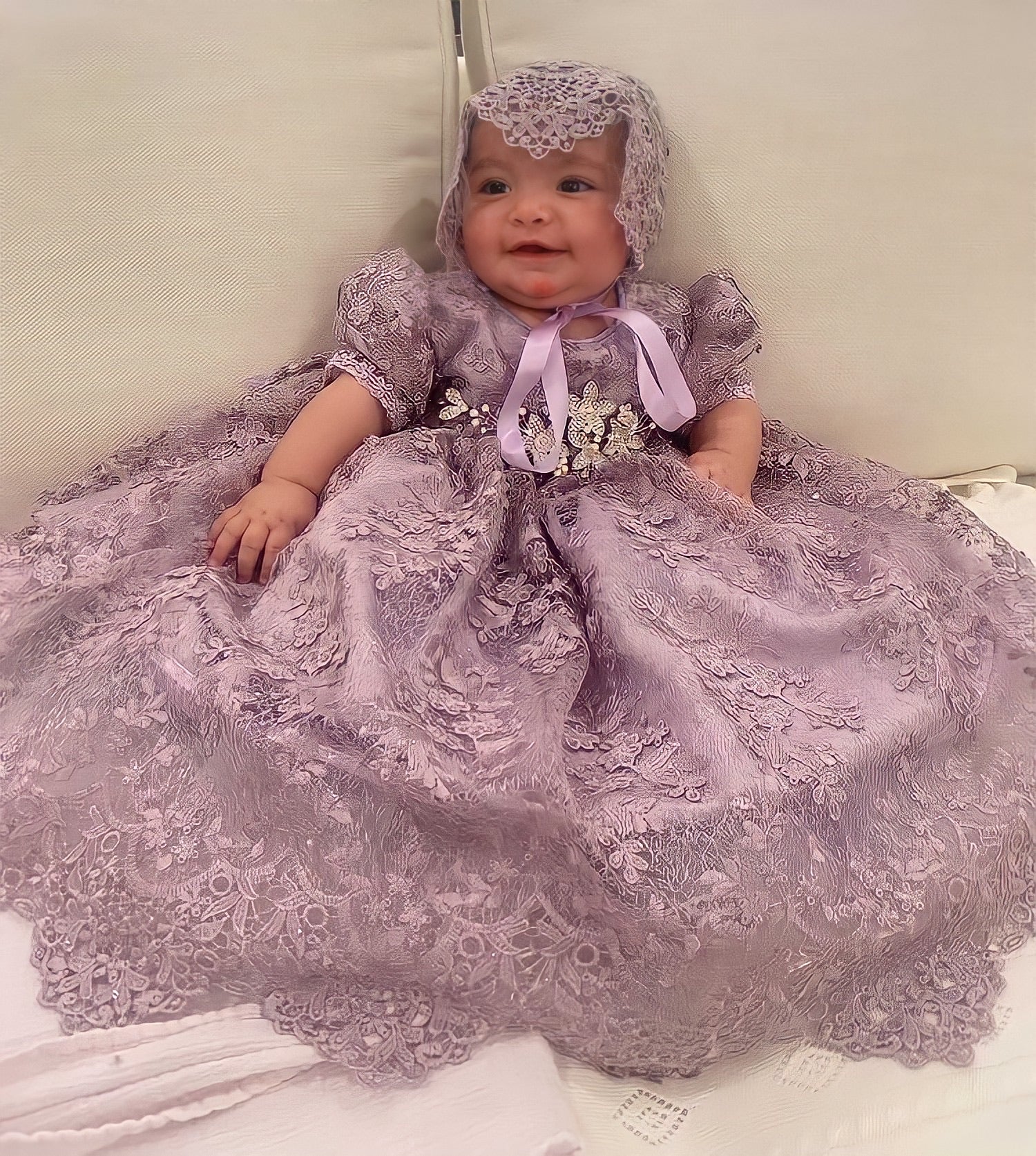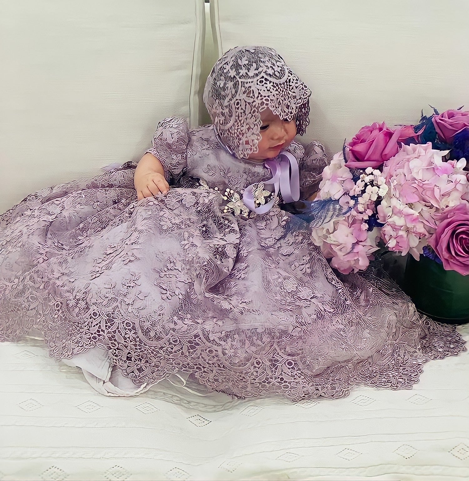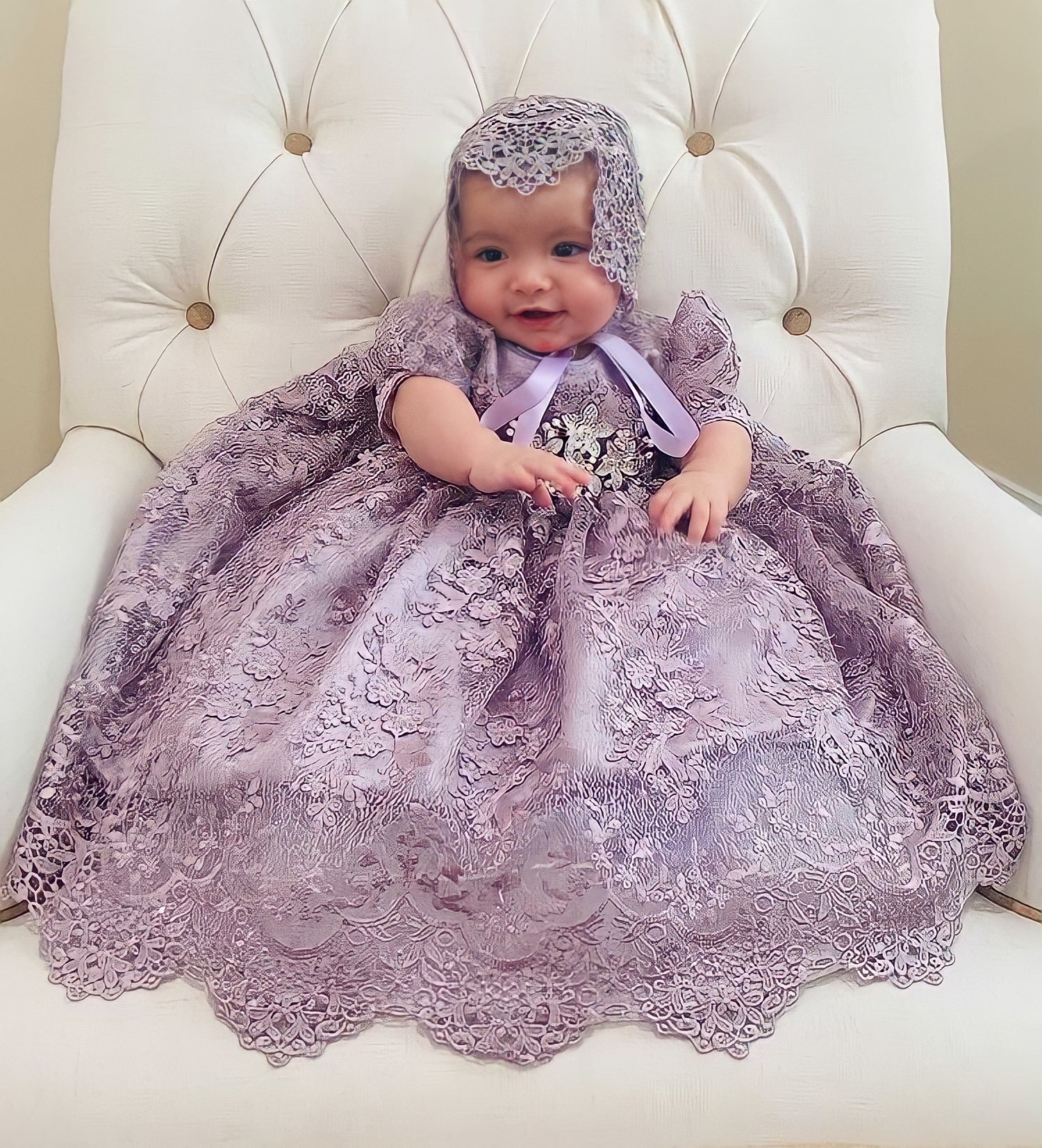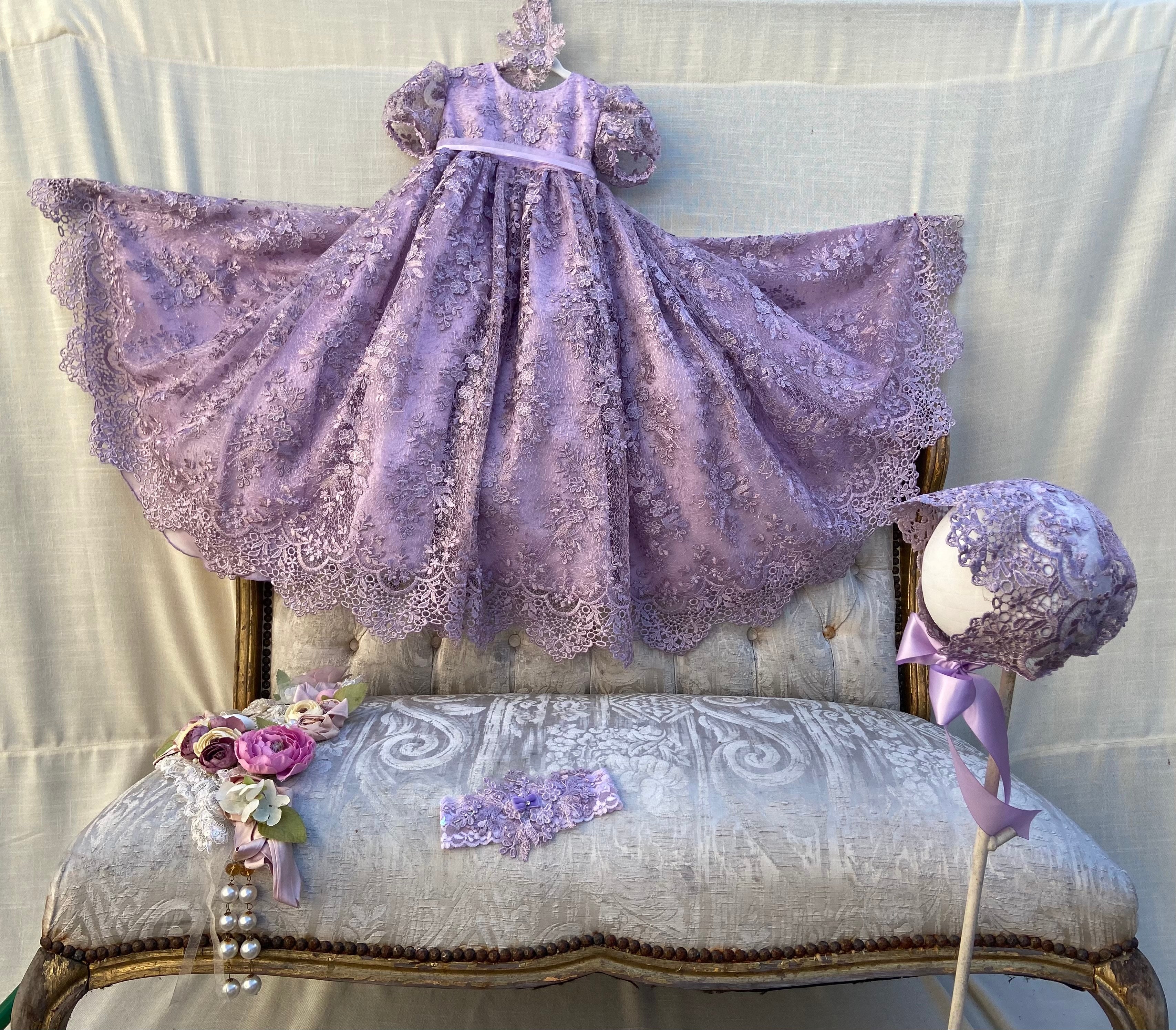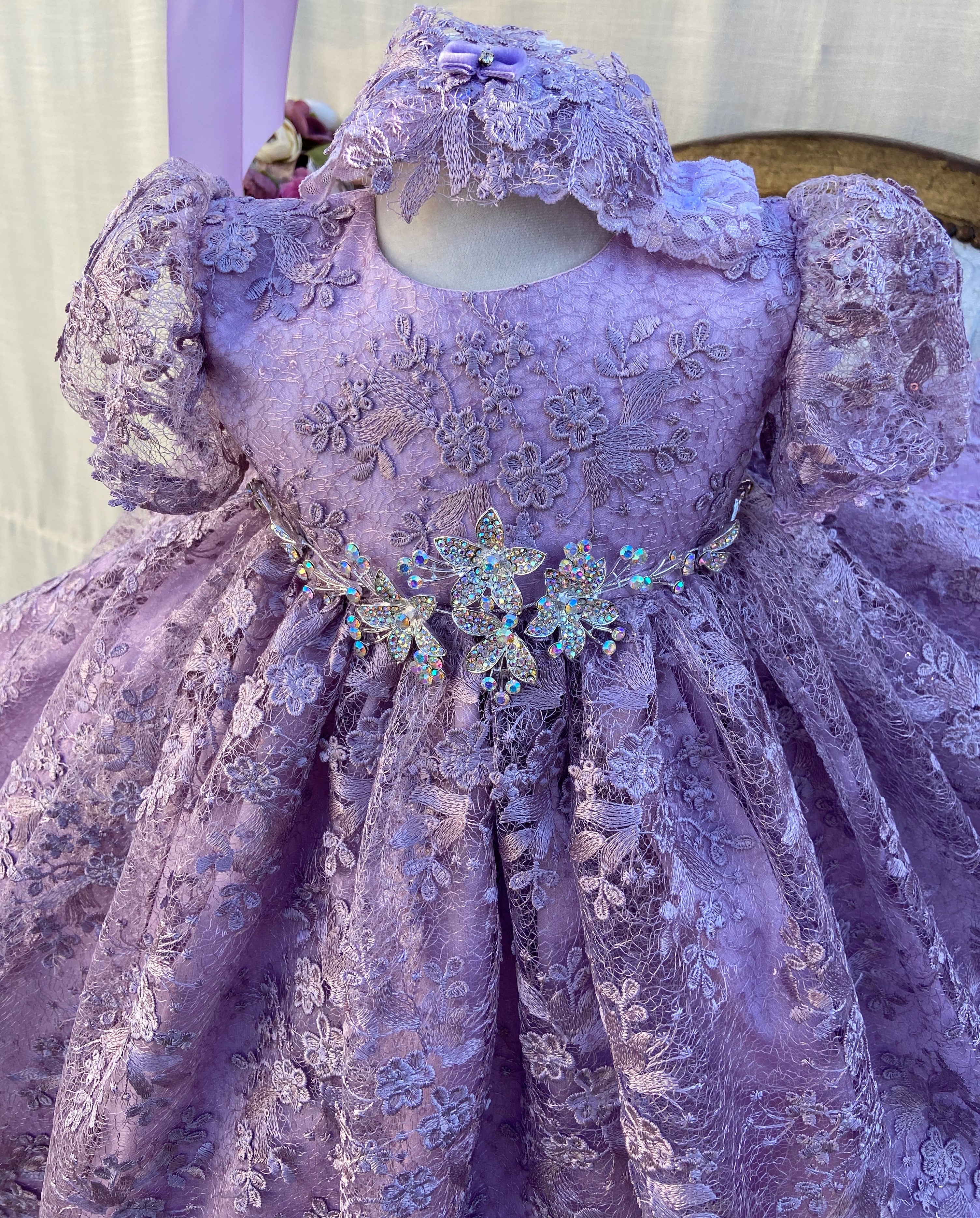 The Violet christening gown from Elena Collection showcases delicate handmade craftsmanship in the US. This elegant lilac dress features: - Imported lilac spider lace - 90" wide skirt with crinoline for fullness - Organza lilac ribbon belt - Matching lace bonnet Available as a toddler dress, it offers refined comfort with hidden seams and luxurious details. Perfect for your special occasion, this gown exudes timeless opulence. Accessories are sold separately.
