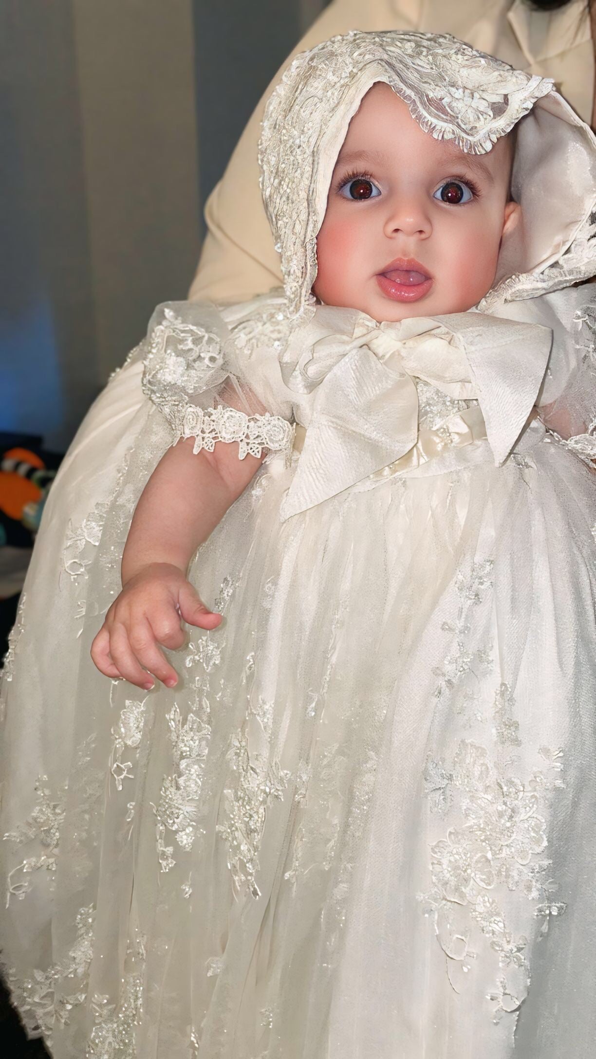 Viviana is an exquisite, handmade ivory silk christening gown crafted with delicate hand-beaded lace and a full lace skirt for a grand appearance. It features elegant puff sleeves trimmed with Venetian lace and a satin ribbon waist for a refined fit. The gown includes a soft lining and a matching bonnet, perfect for a baby’s baptism or special occasion. Made to order in the USA, it offers heirloom quality and timeless style. Fabrics and materials: • Beaded lace • Tulle • Silk • Fusing • Lining • Piping • Buttons. Dry clean only