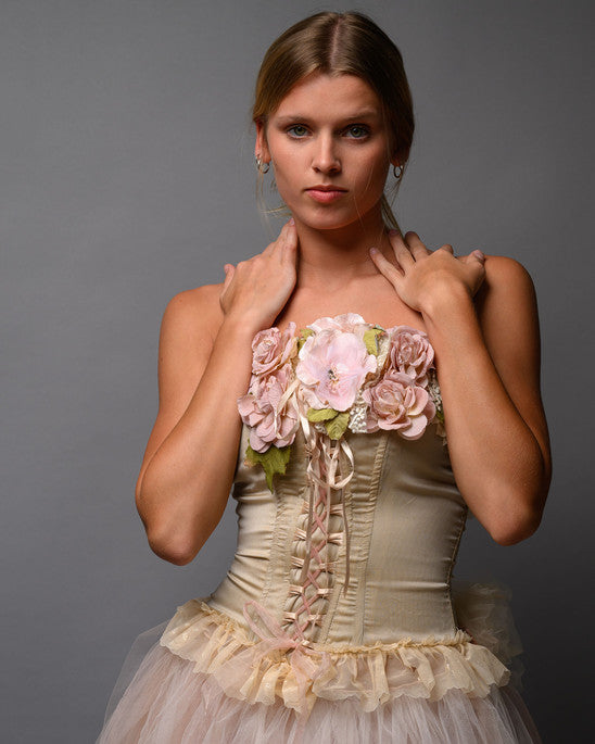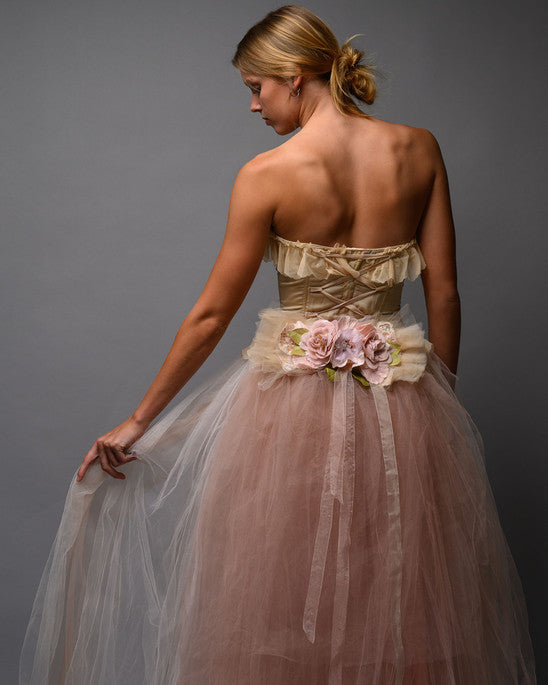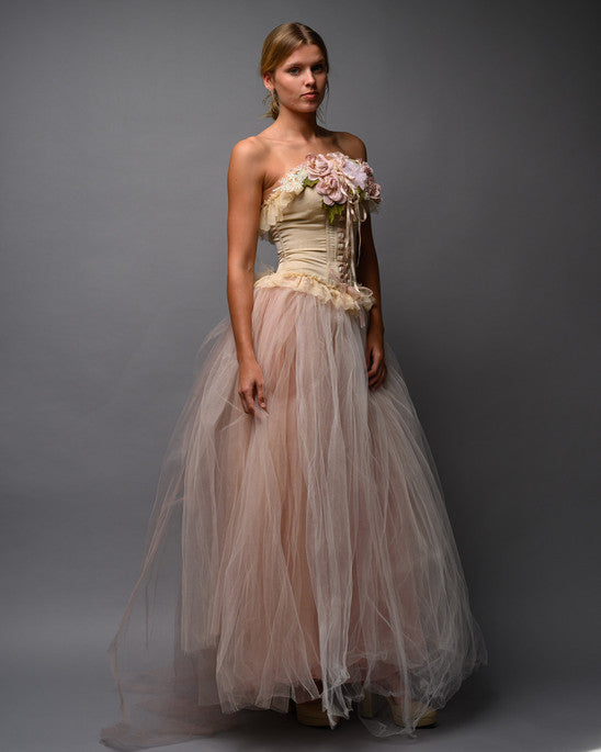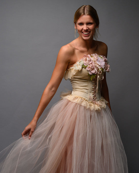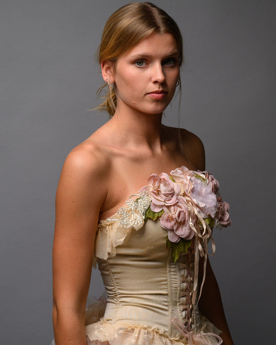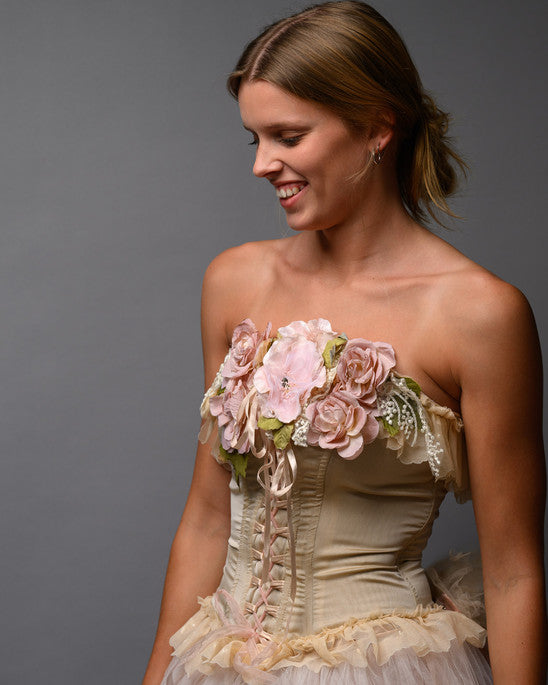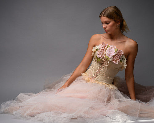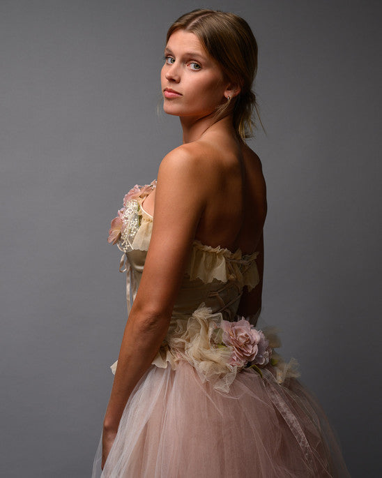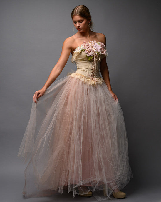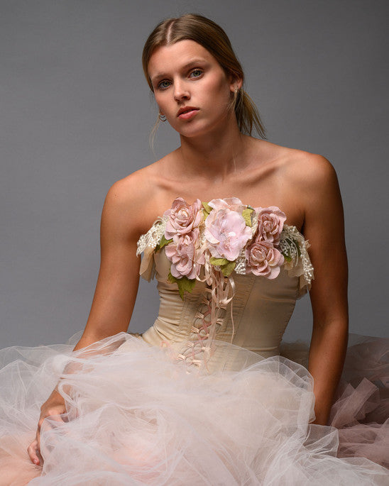 Unveil your artistry on your wedding day in this one-of-a-kind sustainable bridal couture set, where vintage romance meets modern elegance. Featuring a structured blush-nude corset bodice adorned with intricate floral appliqués and delicate pearl accents, this look offers timeless femininity with an avant-garde twist.