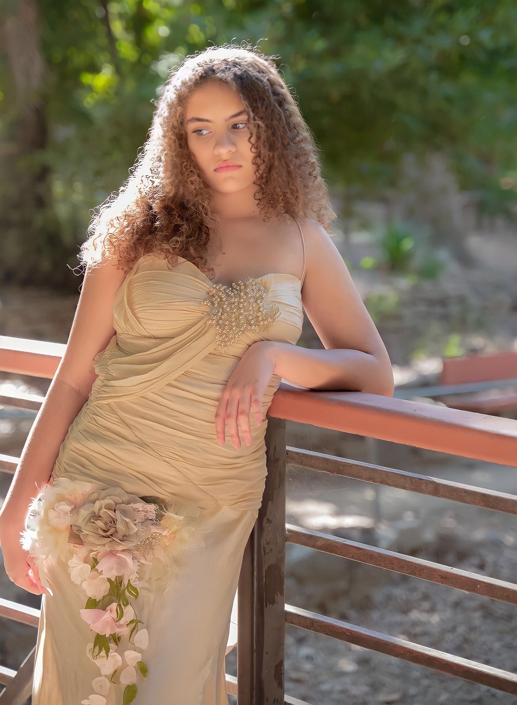 One of a kind bridal Couture silk chiffon dress with a trail and 3D Flower detachable brooch on the front of the skirt and a pearl appliqué on the front bodice.