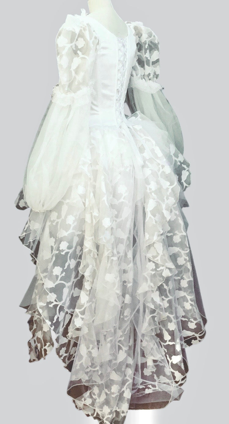 A breathtaking statement piece for the bride who dreams in poetry. This one-of-a-kind couture wedding gown is crafted from luxurious silk damask organza, layered with flowing silk cascading ruffles on a high low design , and constructed on a sculpted satin corset bodice for an unforgettable silhouette. The gown features romantic cloud-like sleeves, cascading botanical organza appliqué, and a delicately gathered tulle skirt that moves with ethereal softness.