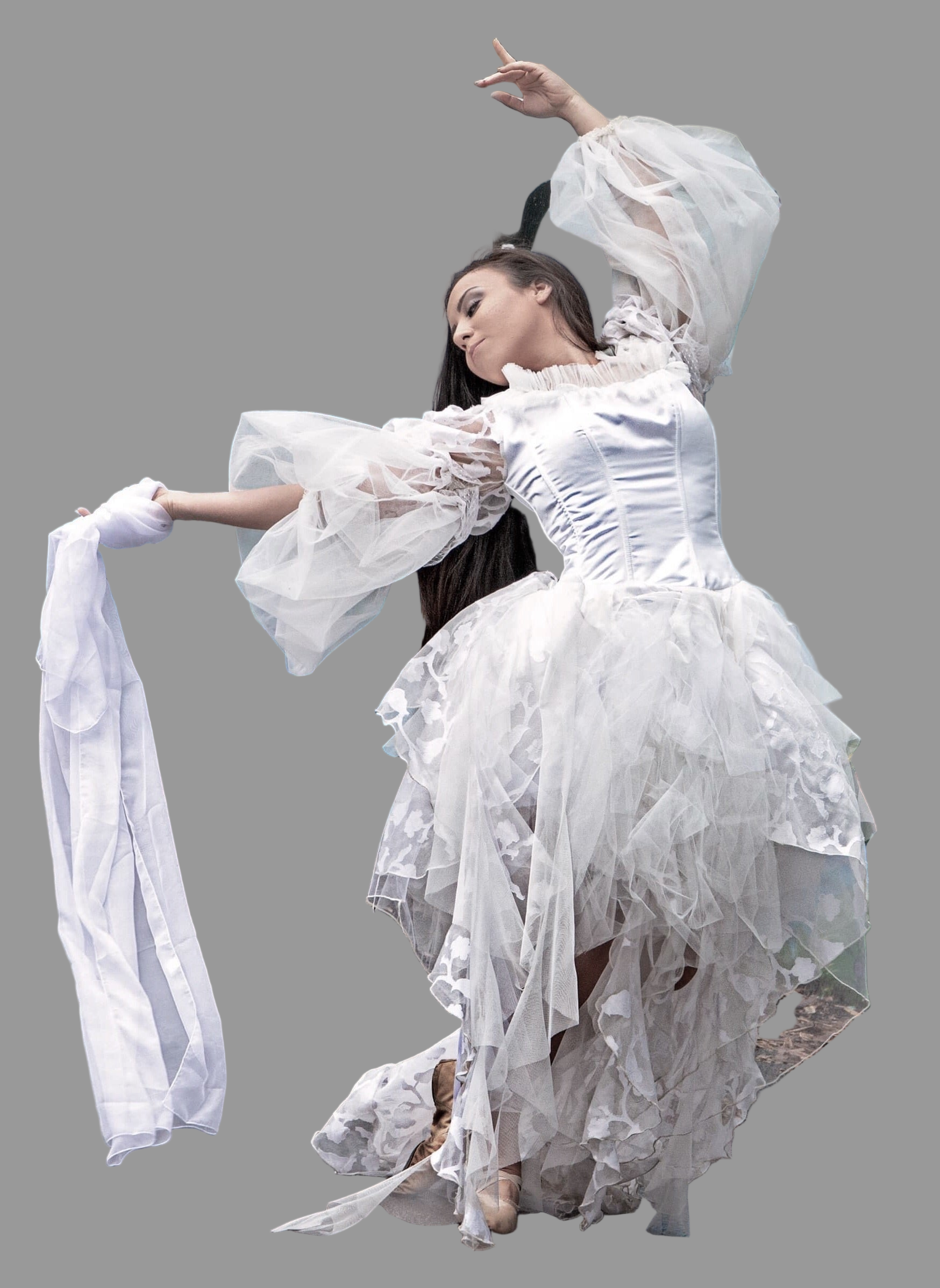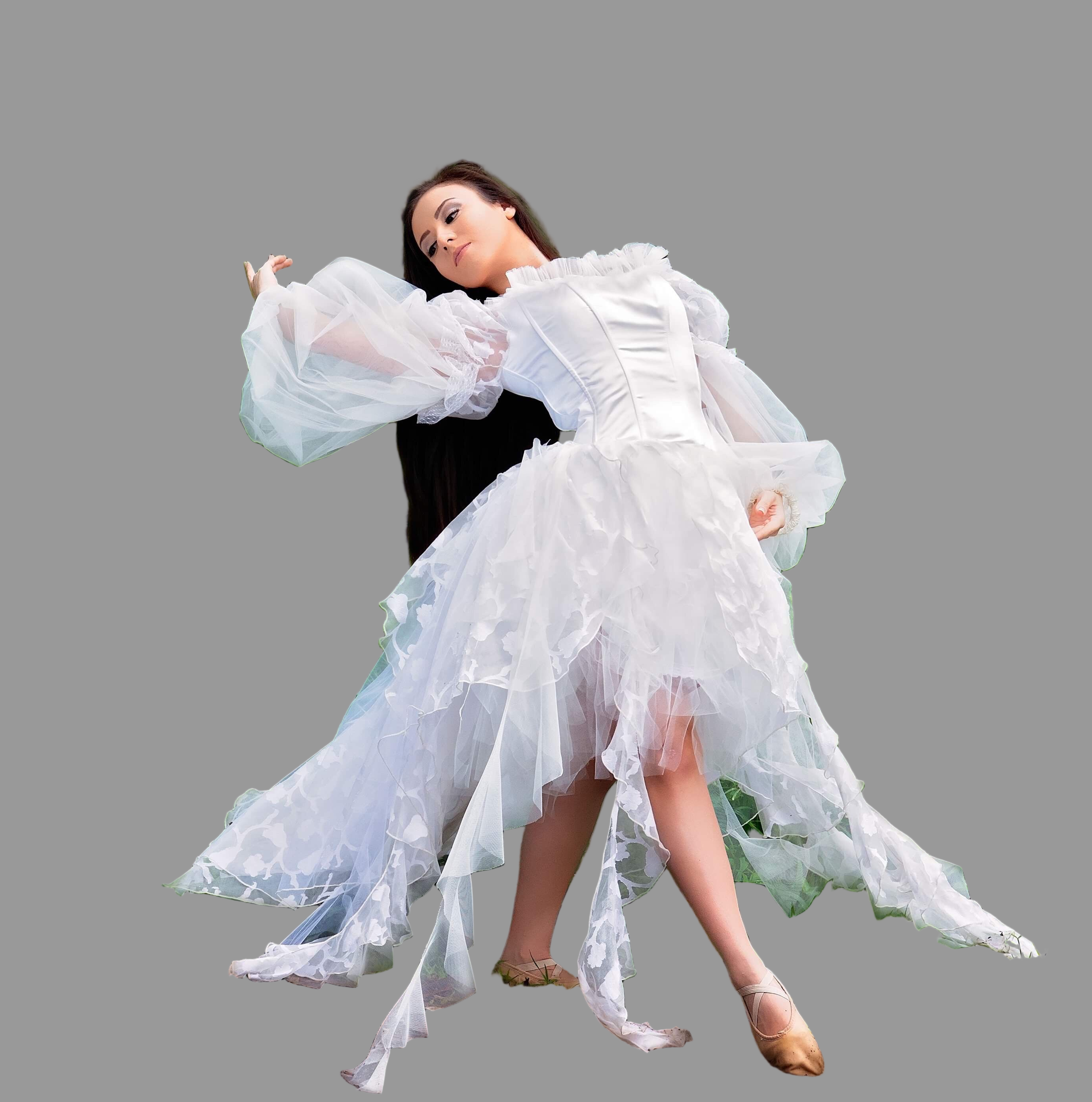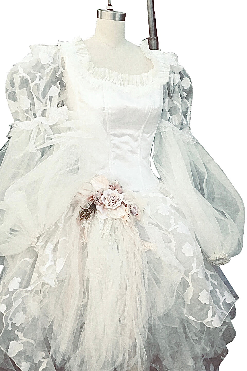 Hand-finished floral embellishments and multilayered textures create a gown that feels both fairytale and high-fashion. Perfect for editorial brides, artistic ceremonies, garden weddings, enchanted-forest themes, or dancers seeking a gown that moves beautifully on camera.